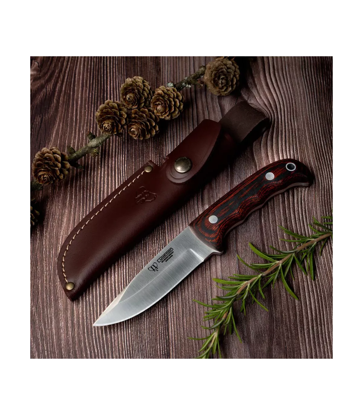 Het lemmet is gemaakt van hoogwaardig roestvrij staal en de gepolijste rode staminahout afwerking op het handvat zorgt voor een comfortabele en veilige grip. Daarnaast is dit mes met zijn elegante en functionele ontwerp perfect voor elke buitenactiviteit, van jagen tot kamperen of wandelen.