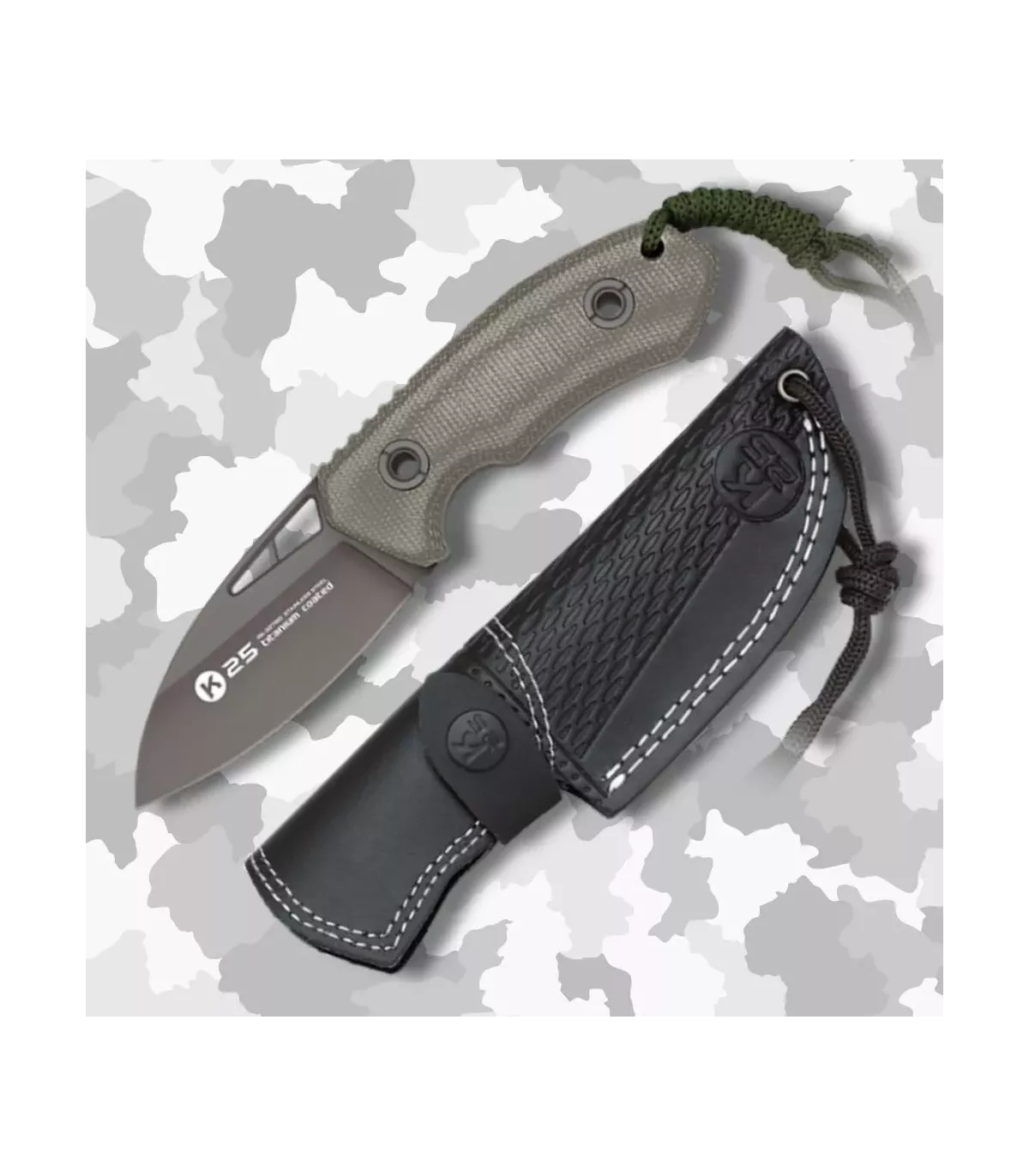 Bovendien beschermt de zwarte leren schede, met witte stiksels en een reliëflogo van 'K 25', niet alleen je mes, maar voegt ook een vleugje elegantie toe. Het praktische ontwerp bevat een bevestigingssysteem waarmee je het veilig kunt dragen, terwijl de groene koord een extra optie biedt om het op de gewenste plek te bevestigen.