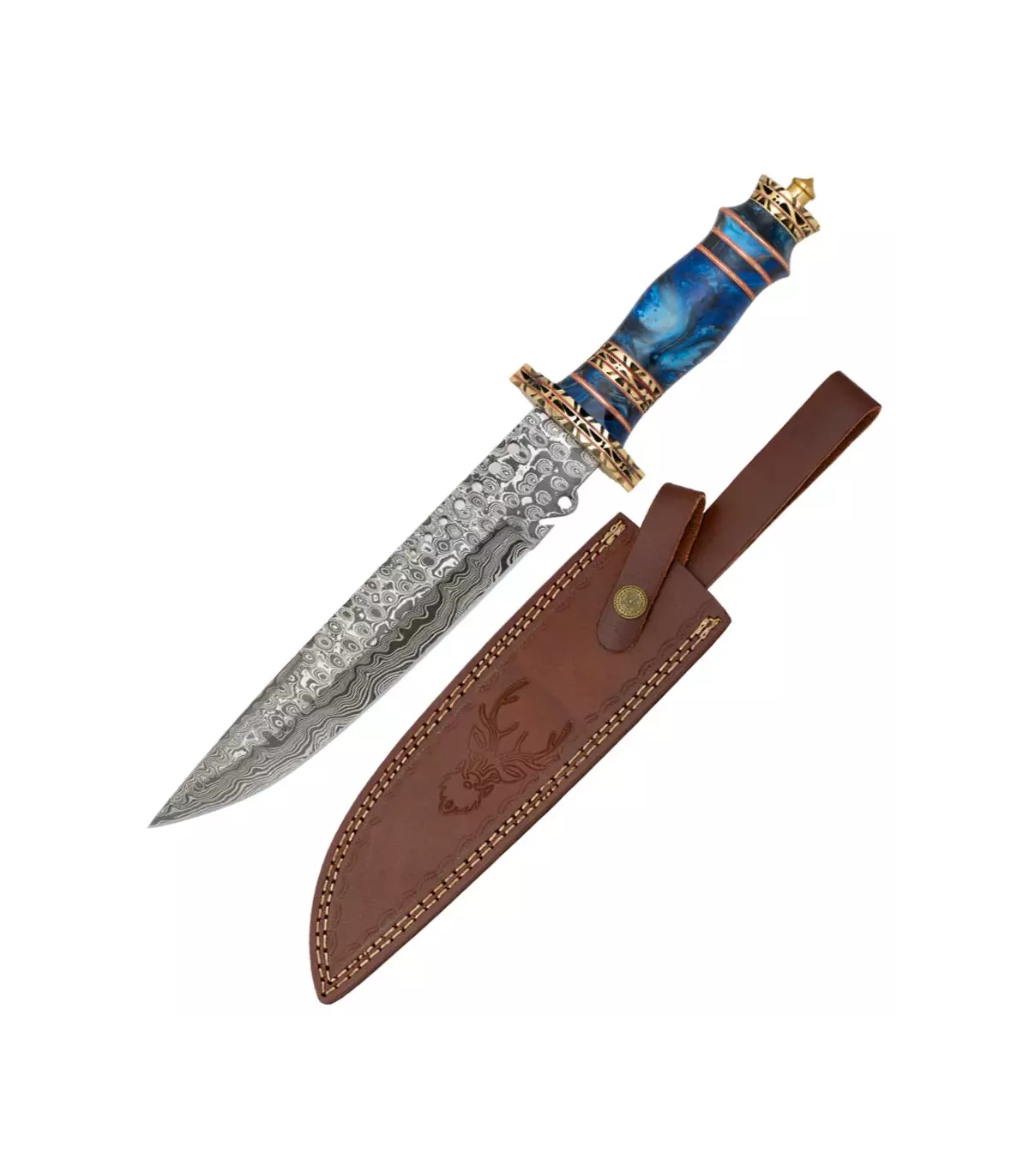 Dit mes onderscheidt zich door zijn Damaststalen blad, dat niet alleen een precieze en duurzame snede garandeert, maar ook elk stuk tot een kunstwerk maakt dankzij het kenmerkende patroon. Het handvat van hars en messing biedt niet alleen een uitstekende grip, maar voegt ook een vleugje verfijning toe, waardoor dit mes een onmisbaar stuk wordt in elke collectie.
