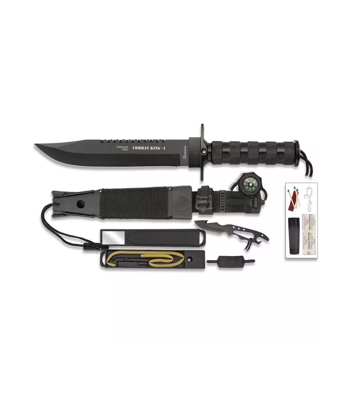Bovendien wordt het geleverd met een leren-PVC (harde) schede, accessoires en een overlevingskit, zodat je het veilig kunt meenemen en over de nodige gereedschappen beschikt in geval van nood. Gemaakt door Martínez Albainox met materialen van topkwaliteit, is het tactische mes Combat King I het ideale gereedschap voor elke buitenactiviteit.