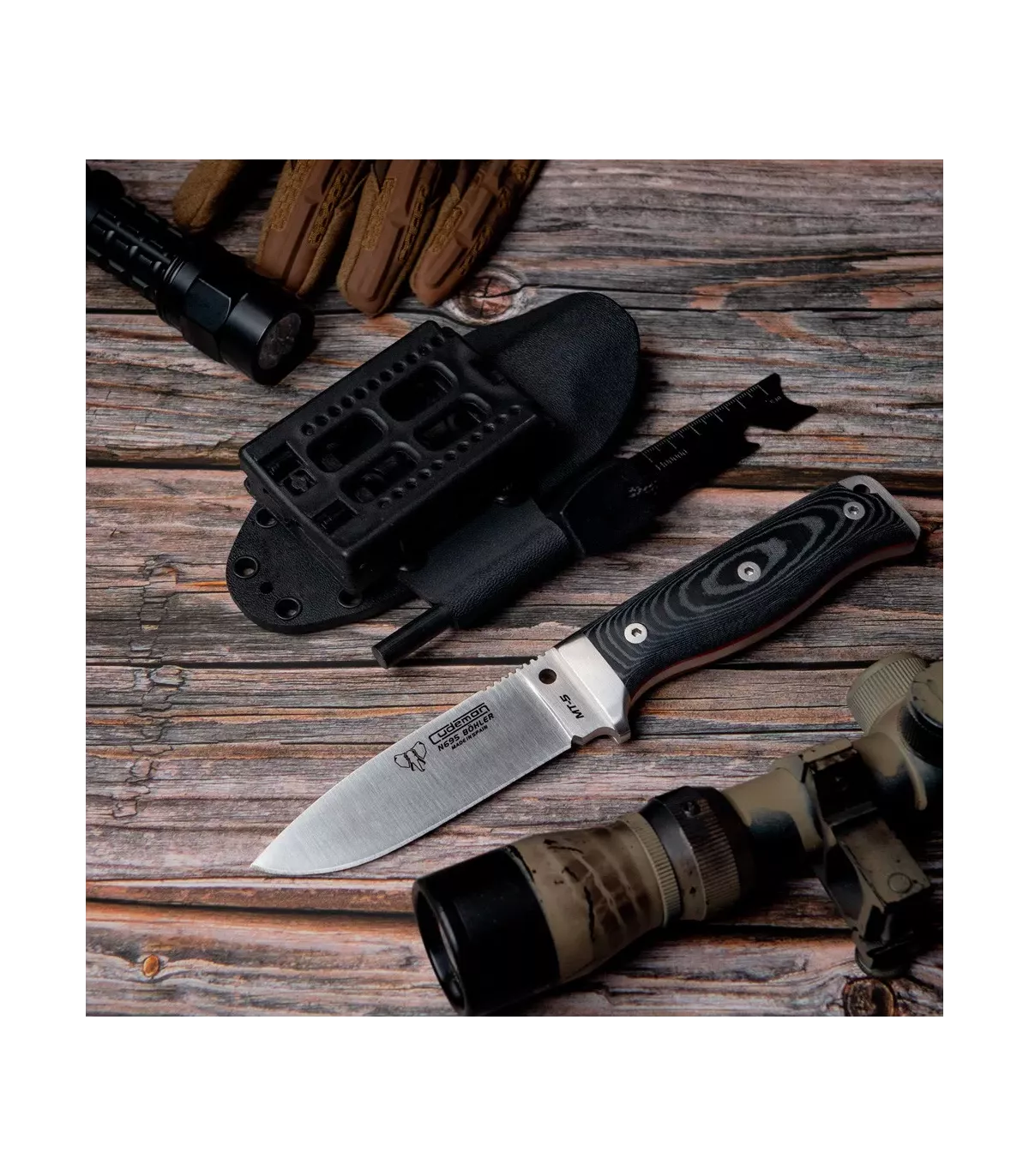 Verhoog uw prestaties met het mes van het merk Cudeman! Dit mes beschikt over een zwart micarta handgreep die een elegante en verfijnde uitstraling geeft. Daarnaast biedt het lemmet van Böhler N-695 staal met een satijnen afwerking u een precieze en efficiënte snede in elke situatie. Dit mes is perfect voor avonturen in de natuur, kamperen, wandelen en nog veel meer.