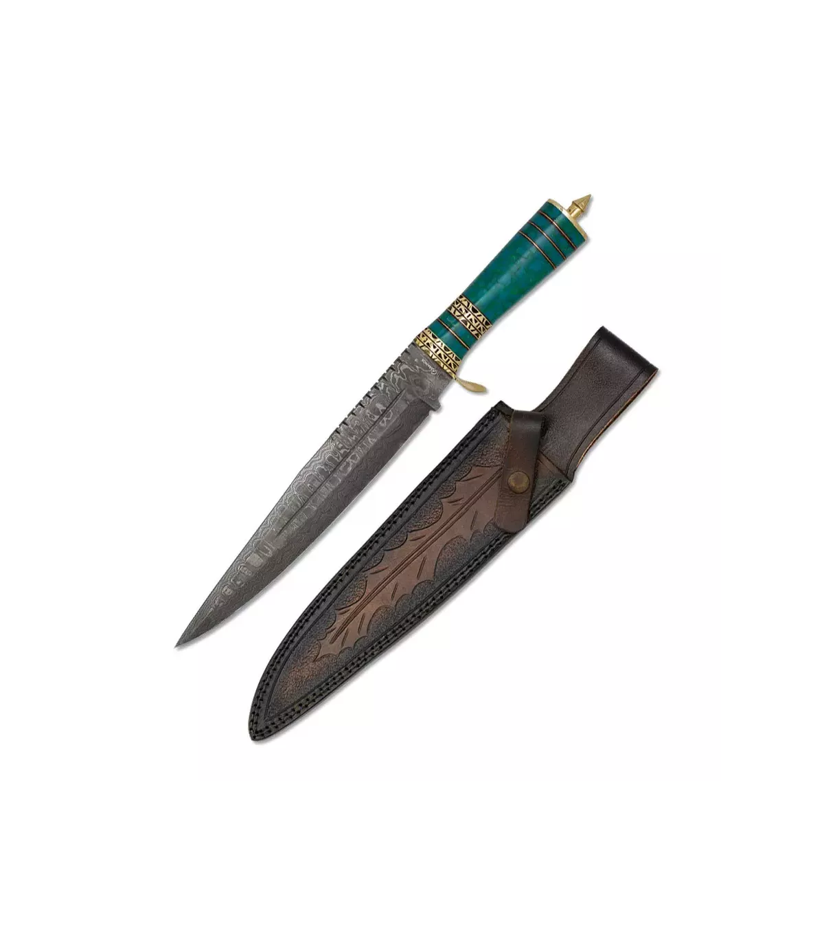 Het damast stalen lemmet met 256 lagen biedt uitzonderlijke sterkte en duurzaamheid, terwijl het versierde handvat een vleugje elegantie en stijl toevoegt. Bovendien wordt een gegraveerde leren schede meegeleverd, zodat u het overal mee naartoe kunt nemen.