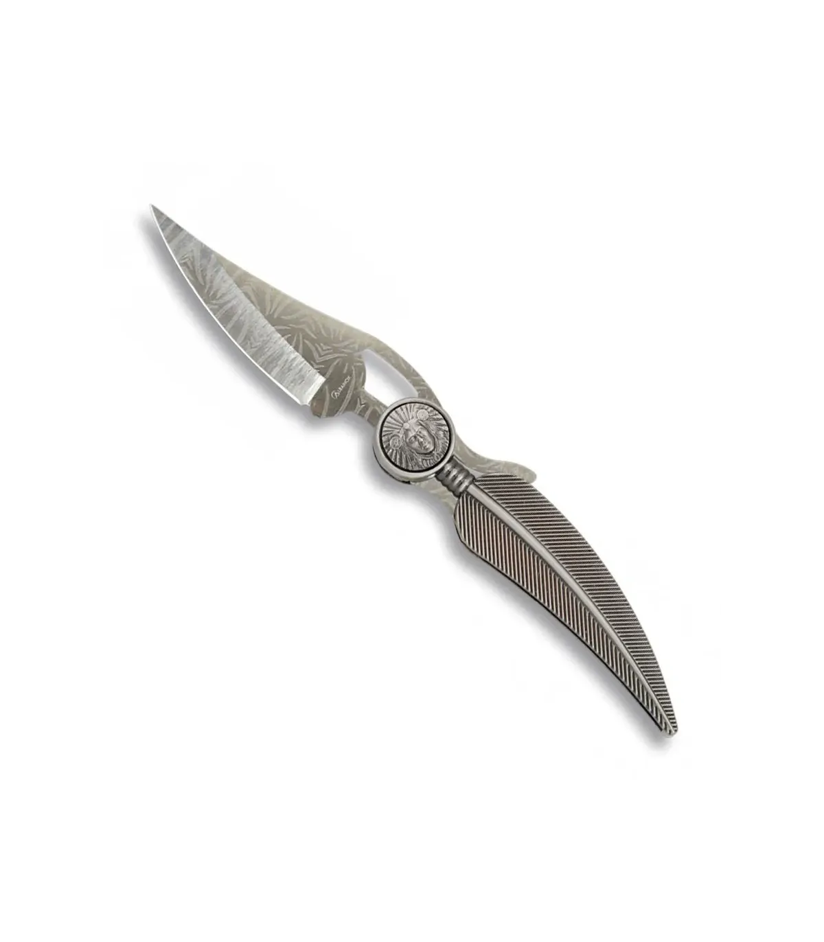 - Lasergecoat afwerking: De lasergecoat afwerking voegt niet alleen een esthetisch uiterlijk toe aan het lemmet, maar benadrukt ook de details en de schoonheid van de inheemse Amerikaanse decoratie.