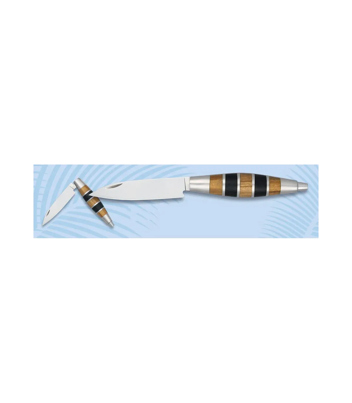 De combinatie van aluminium en hout in het handvat geeft dit mes een elegante en functionele uitstraling. Het veelzijdige ontwerp en de pistonsvergrendeling maken het een praktische tool voor verschillende dagelijkse toepassingen.