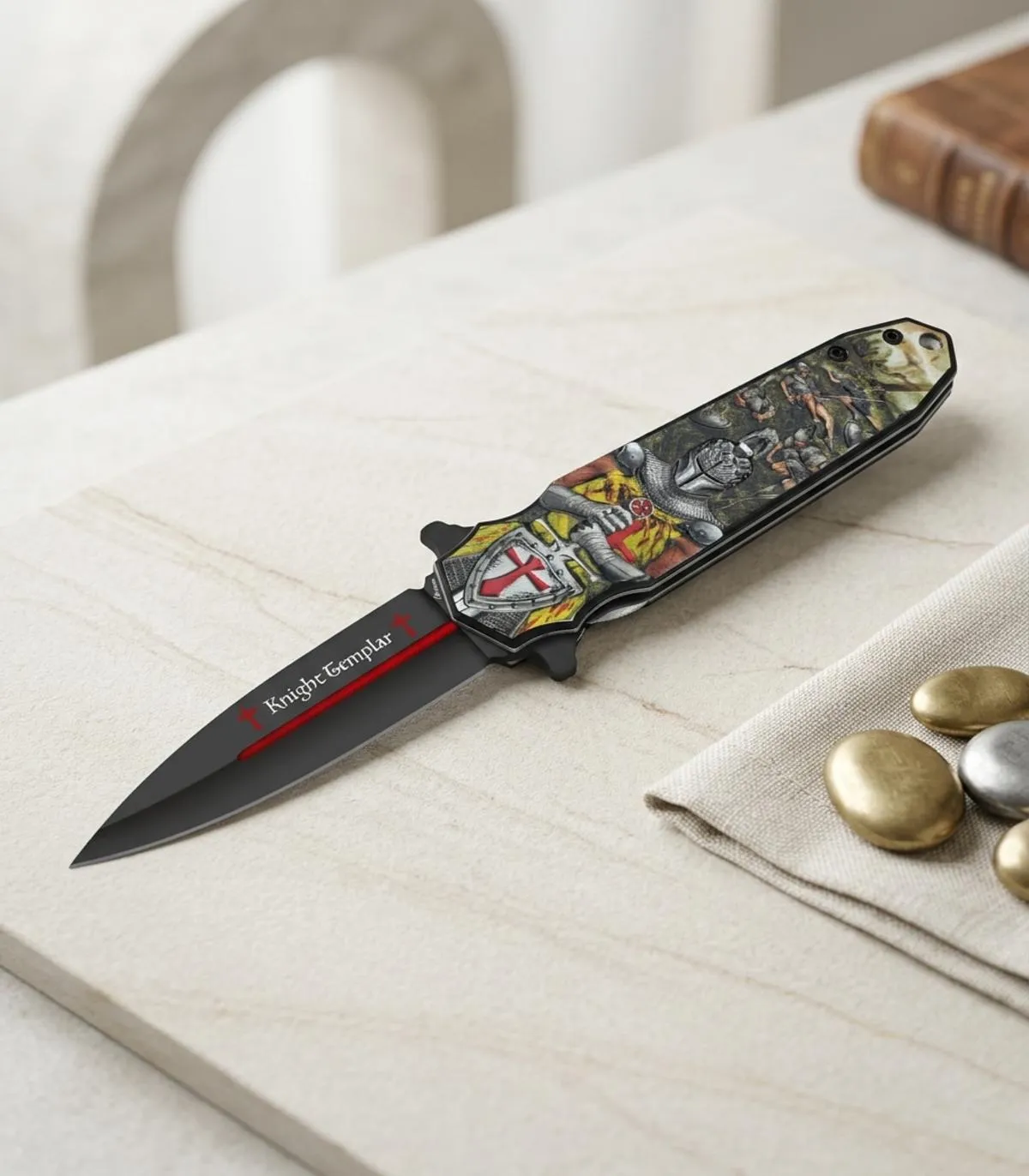 Dit automatische mes, met een lemmet van 8,9 cm van roestvrij staal en een in 3D versierde afwerking, vervult niet alleen praktische functies, maar versterkt ook jouw identiteit. Het is een verlengstuk van je geest, dat je herinnert aan je lijnen van eer en veerkracht bij elke opening, bij elke beweging. Het handvat, met illustraties die de middeleeuwse wereld oproepen, biedt je een stevige en ergonomische grip, zodat elk gebruik een bevestiging is van controle en autoriteit. De aanwezigheid van ornamentale details voegt die sprankeling toe die ervoor zorgt dat je houding onstopbaar is, alsof je een symbool van je ware zelf draagt, klaar voor elke uitdaging. Dit is niet zomaar een mes: het is jouw bondgenoot in persoonlijke verovering, jouw constante herinnering dat de kracht ligt bij degenen die die sprankeling van een ridder in zich hebben.