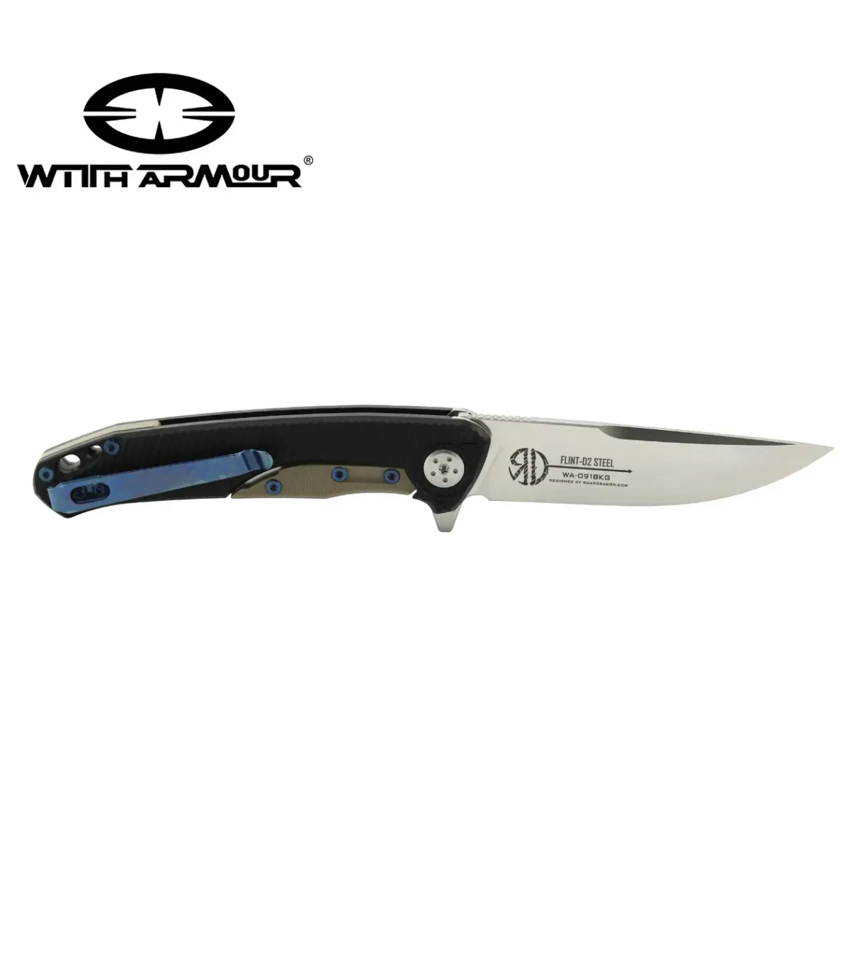 Ontdek de Flint zakmes, een echt juweel ontworpen door de gerenommeerde Amerikaanse fabrikant With Armour! Met zijn innovatieve LINER LOCK-systeem biedt dit mes een gemakkelijke en snelle uitklapbaarheid, waardoor functionaliteit en gemak bij elk gebruik worden gegarandeerd. De handgreep van 4,5 inch zorgt voor een comfortabele en veilige grip, terwijl de dikte van het lemmet van 3,5 mm uitzonderlijke sterkte en duurzaamheid garandeert.