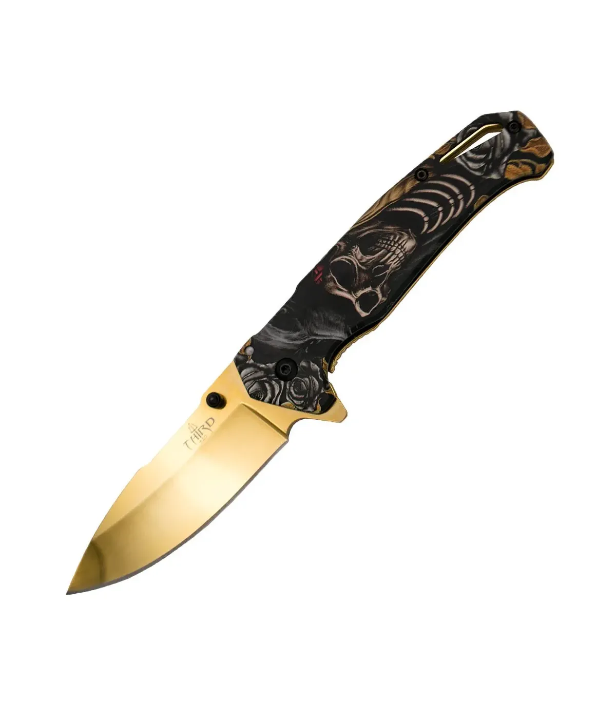 De assisted tactische zakmes Third model K1930 Gouden Dood is een veelzijdig en duurzaam gereedschap dat perfect is voor diverse taken, van het openen van pakketten tot het snijden van vlees. Het lemmet van 420 staal met een gouden titanium coating is stevig en scherp, en het handvat van aluminium, versierd met een schedel, ligt comfortabel in de hand en is veilig in gebruik. Het zakmes wordt ook geleverd met een ingebouwde flesopener.