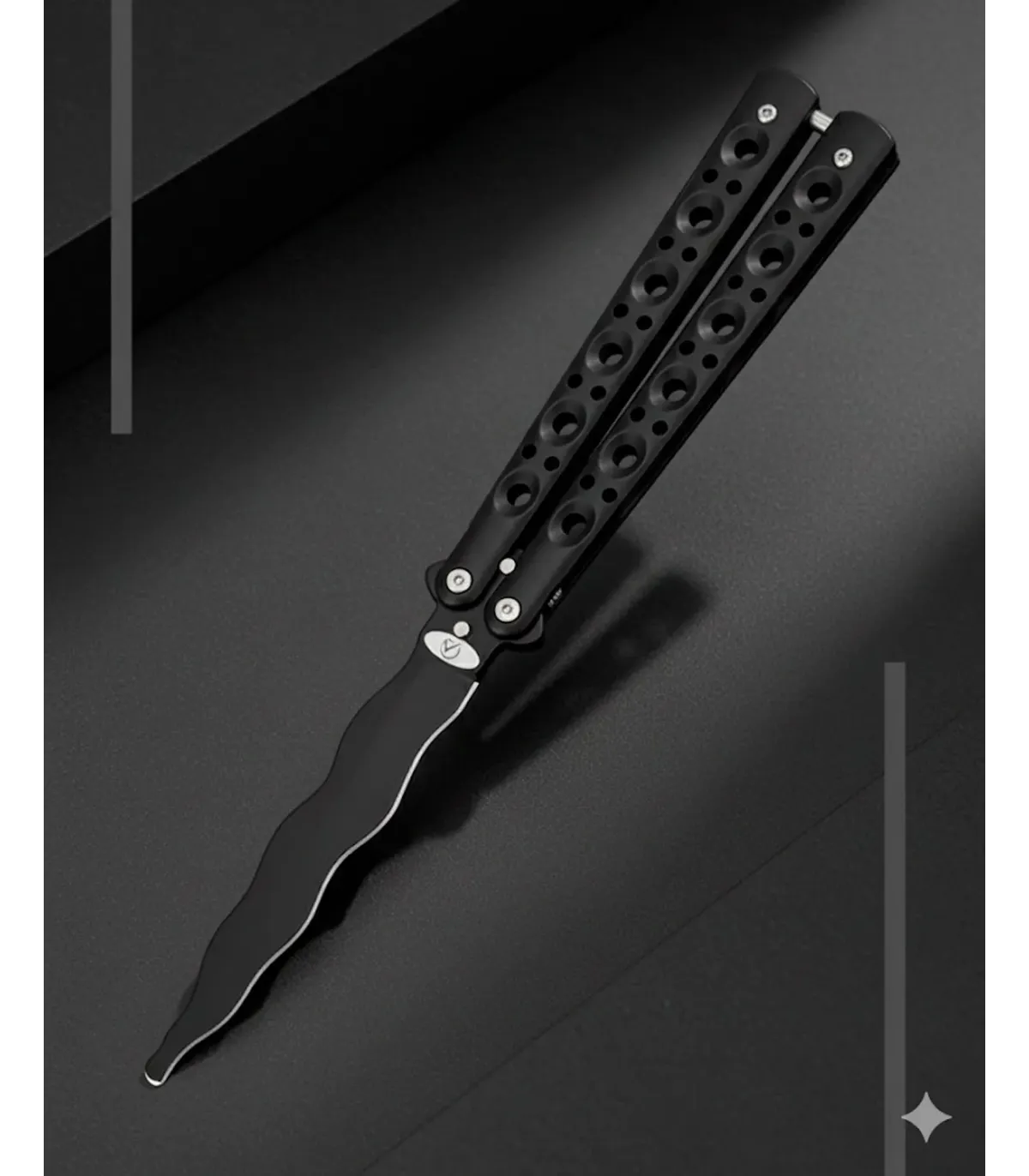 Het geperforeerde stalen handvat geeft niet alleen een gedurfd ontwerp, maar verbetert ook de grip, wat meer precisie biedt. De zwarte esthetiek, gecombineerd met details zoals het logo in het midden, maakt het een opvallend accessoire voor zowel verzamelaars als trainingliefhebbers in het manipuleren van balisong- of vlindermessen.
