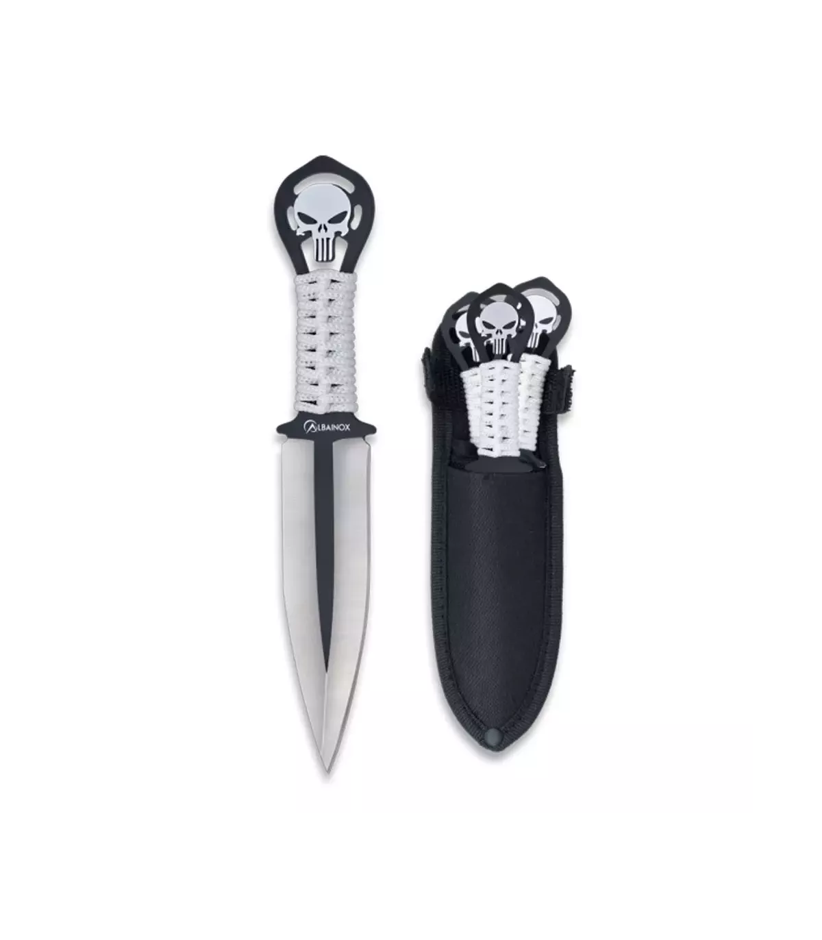 Wat deze set bijzonder maakt, is het schedelontwerp op de gevlochten handgreep van elke werpkni ve. Dit ontwerp geeft niet alleen een uniek accent, maar zorgt ook voor een comfortabele en veilige grip voor een stabiele en precieze worp. Bovendien wordt de set van drie werpknives van het merk Albainox, model schedel, geleverd met een nylon schede om ze veilig en beschermd te houden wanneer u ze meeneemt.