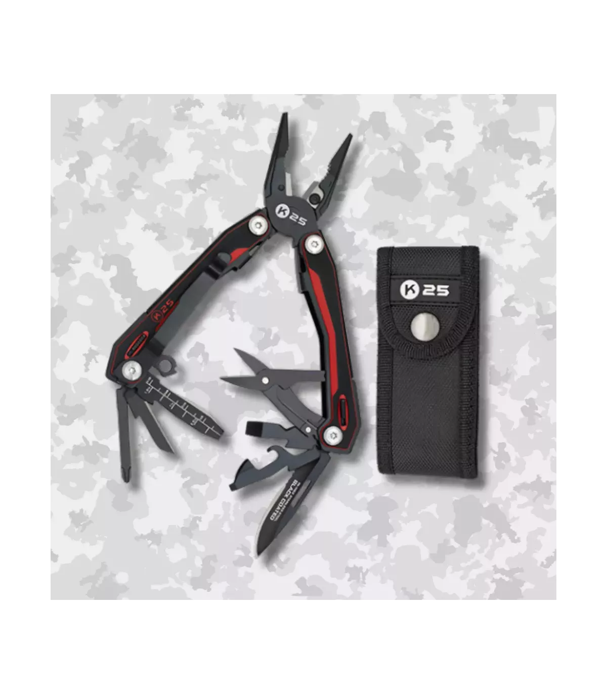 Com um design engenhoso, esta ferramenta multifuncional da marca K25 integra múltiplas ferramentas que permitirão enfrentar qualquer desafio. Desde alicates e tesouras até uma pequena faca, cada elemento foi pensado para oferecer a máxima utilidade em situações cotidianas ou em suas escapadas ao ar livre.