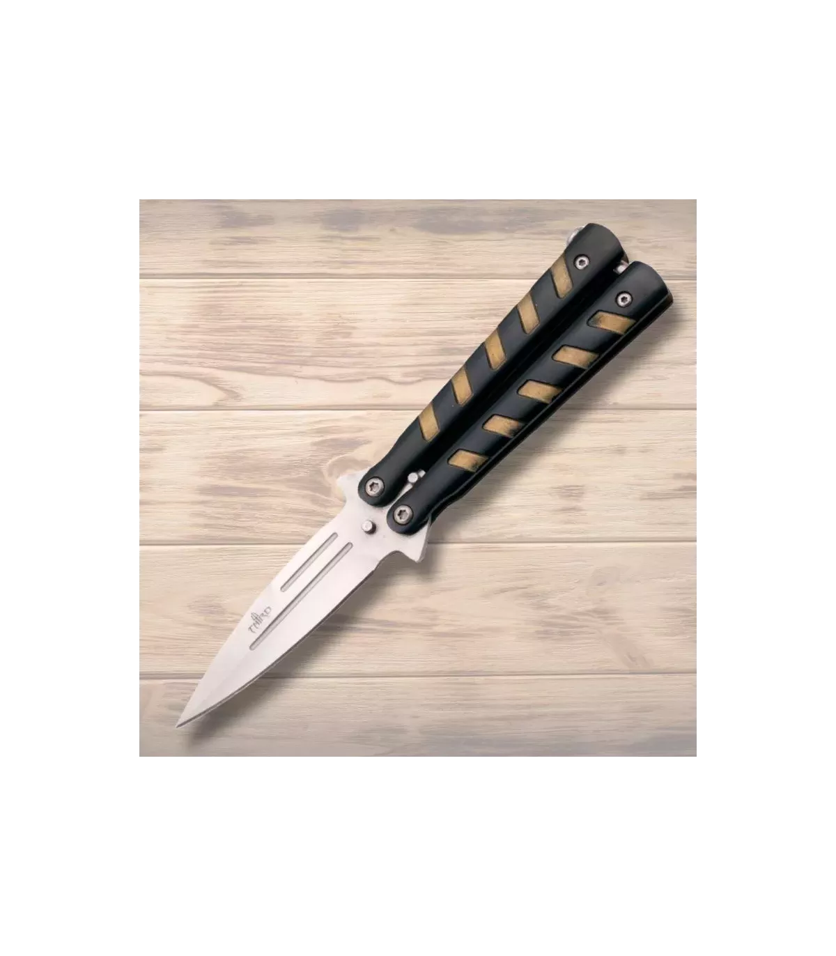 Procura uma ferramenta elegante e funcional que se destaque pelo seu estilo e praticidade? Esta faca tipo borboleta oferece exatamente isso, combinando um design sofisticado com uma excelente qualidade nos seus materiais. Seu acabamento preto com detalhes dourados no cabo de aço inoxidável confere um toque distinto, ideal para quem aprecia produtos com carácter e bom gosto.