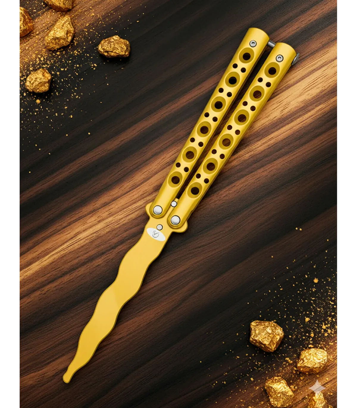 Seu acabamento em dourado brilhante realça sua aparência distinta, enquanto a lâmina flamejante assimétrica de 2,60 mm de espessura confere um toque único, com uma lâmina que combina estilo e desempenho. A estrutura tipo balisong, com mecanismo de trava no pomo, garante uma abertura e fechamento suaves e seguros, permitindo um manuseio preciso e confortável.