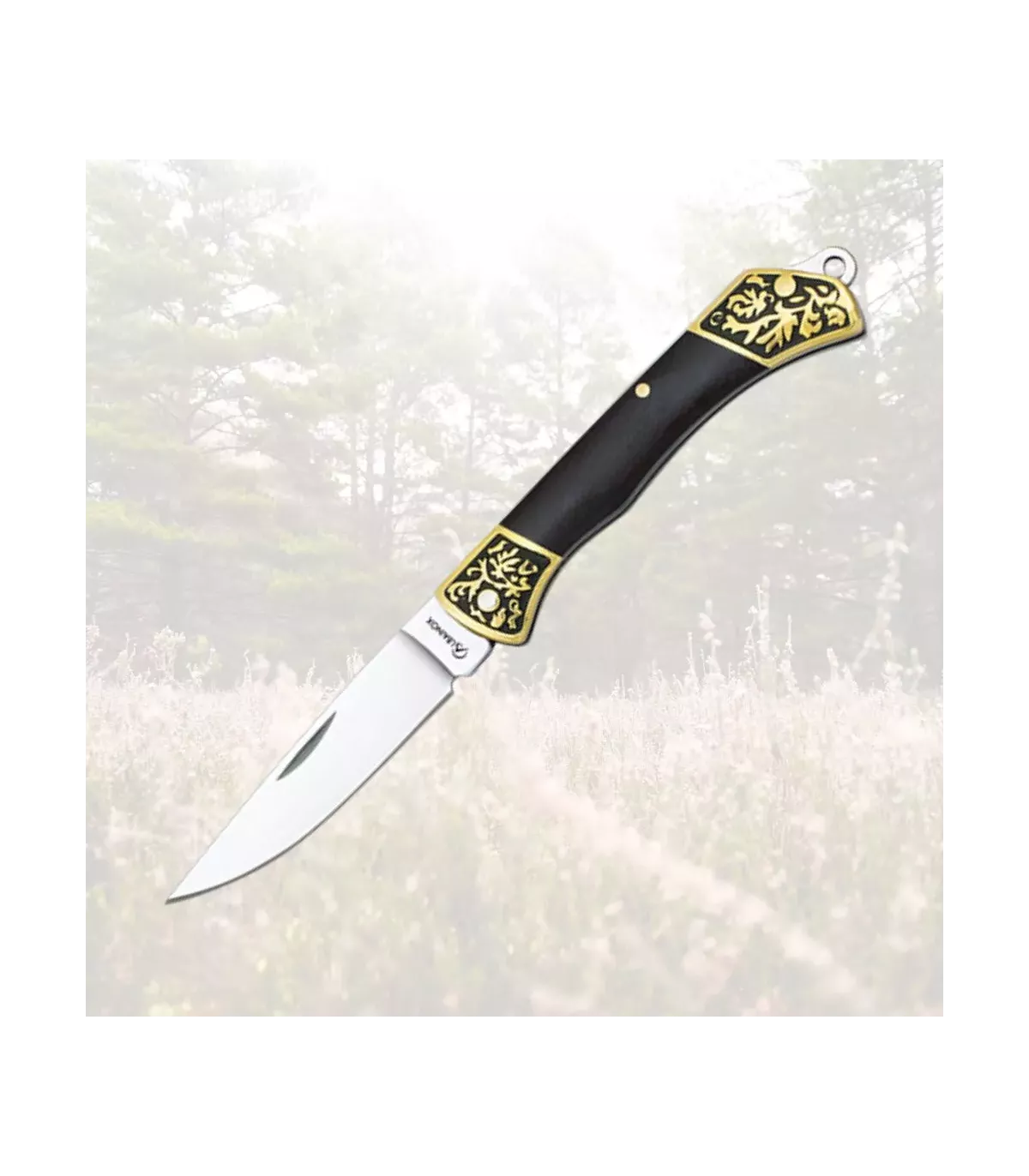 Seu cabo de acrílico preto, decorado com detalhes em latão e acabamento que simula madeira escura, proporciona uma pegada firme e segura. Além disso, conta com um sistema de trava de pistão, garantindo maior segurança durante o manuseio. Embora não possua bainha, sua estrutura bem concebida torna esta navalha uma aliada confiável no campo, perfeita para atividades ao ar livre, camping ou tarefas cotidianas.