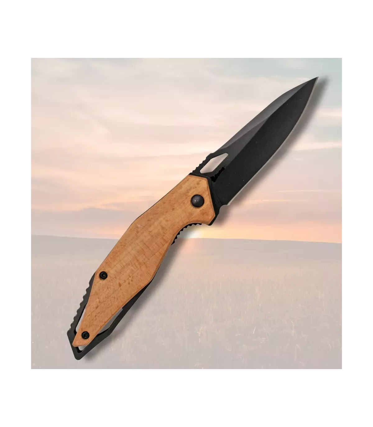 Com uma empunhadura de madeira de faia, seu acabamento suave e natural não só proporciona uma pegada confortável, mas também acrescenta um toque de calor e estilo. A lâmina de aço 420, com seu acabamento preto fosco, não é apenas visualmente impressionante, mas também garante uma durabilidade excepcional e resistência ao desgaste. Seu design afiado e fino permite cortes precisos, tornando-o a ferramenta ideal para qualquer tarefa, desde preparar uma refeição até realizar reparos rápidos.