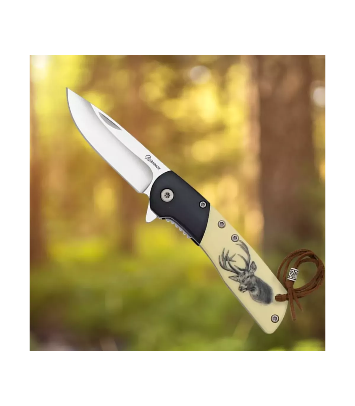 Com uma lâmina fabricada em aço 3CR13MOV, garante um corte preciso e resistência a longo prazo. Seu acabamento acetinado confere-lhe uma aparência refinada e profissional. Além disso, seu cabo combina madeira preta e ABS, oferecendo uma pegada firme, confortável e elegante. Inclui uma gravação exclusiva de um veado na empunhadura, um detalhe que não só destaca sua estética, mas também confere-lhe um caráter único.