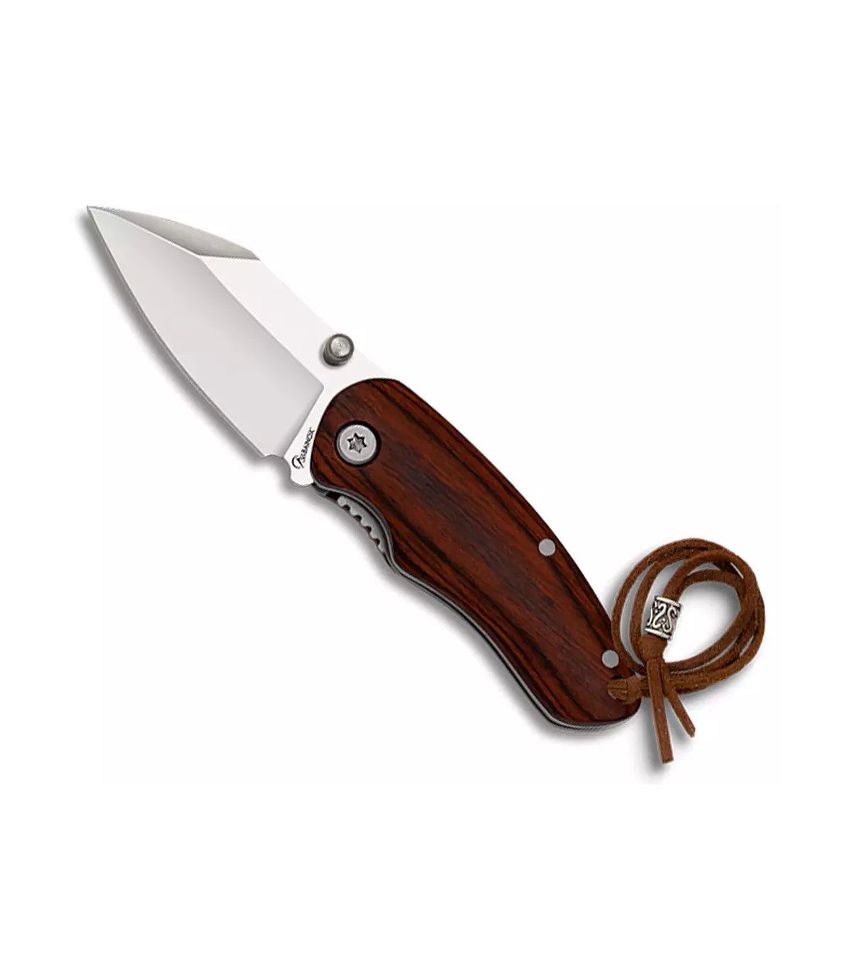 Apesar de não possuir abertura assistida nem tetón, seu design é intuitivo e eficiente. O sistema de bloqueio do tipo liner lock garante que a lâmina permaneça no lugar durante o uso, assegurando uma manipulação segura em todo momento. O cordão de polipiel com detalhe metálico não só acrescenta um toque decorativo ao conjunto, como também facilita o transporte do canivete, seja na cintura, na mochila ou pendurado em qualquer outro acessório.