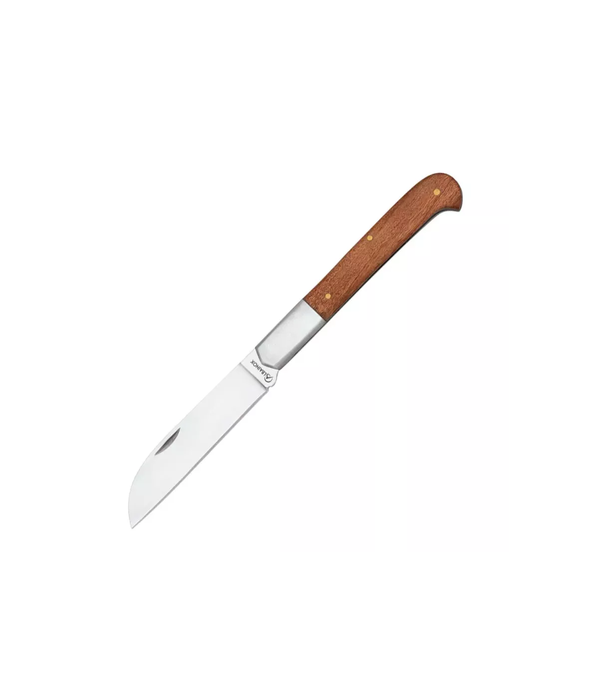 O cabo de madeira confere um toque clássico e refinado, oferecendo uma pegada confortável e segura. A madeira, além de ser visualmente atraente, proporciona uma textura agradável ao toque, assegurando que o canivete permaneça firme na mão mesmo durante uso prolongado. A virola de aço inoxidável e os forros inoxidáveis reforçam a estrutura do canivete, proporcionando maior robustez e estabilidade.
