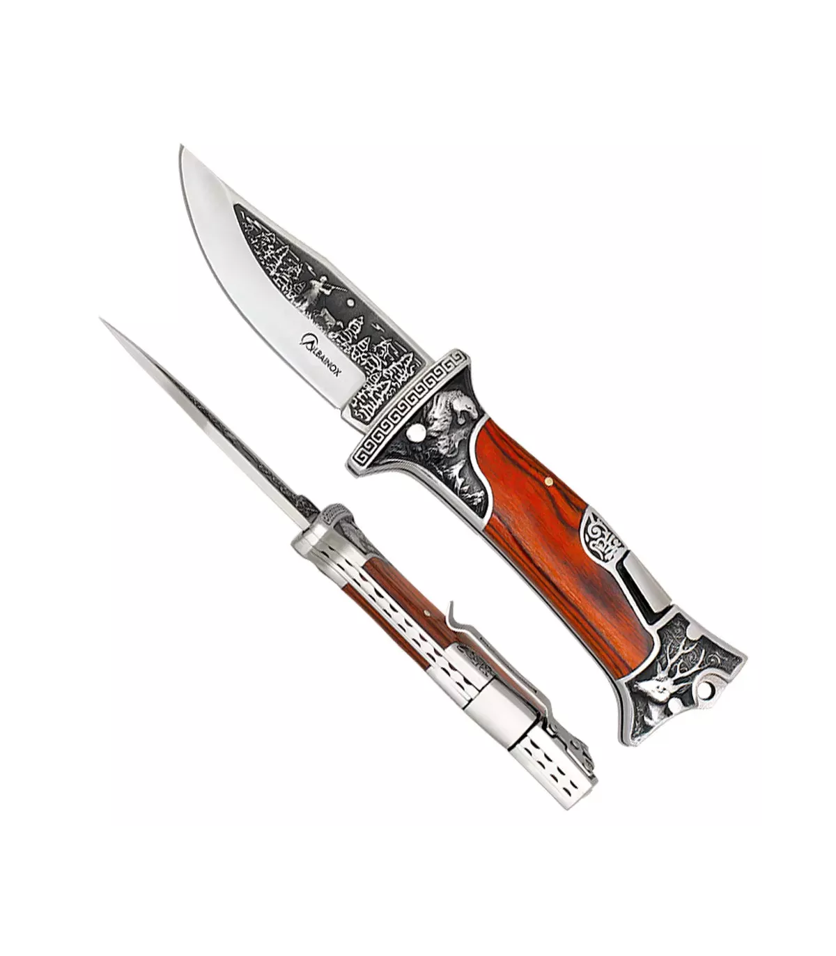 - Tipo de lâmina: Normal com acabamento acetinado e motivo de caça, que não só oferece uma aparência atraente, mas também minimiza os reflexos, tornando este canivete uma ferramenta prática e esteticamente agradável.