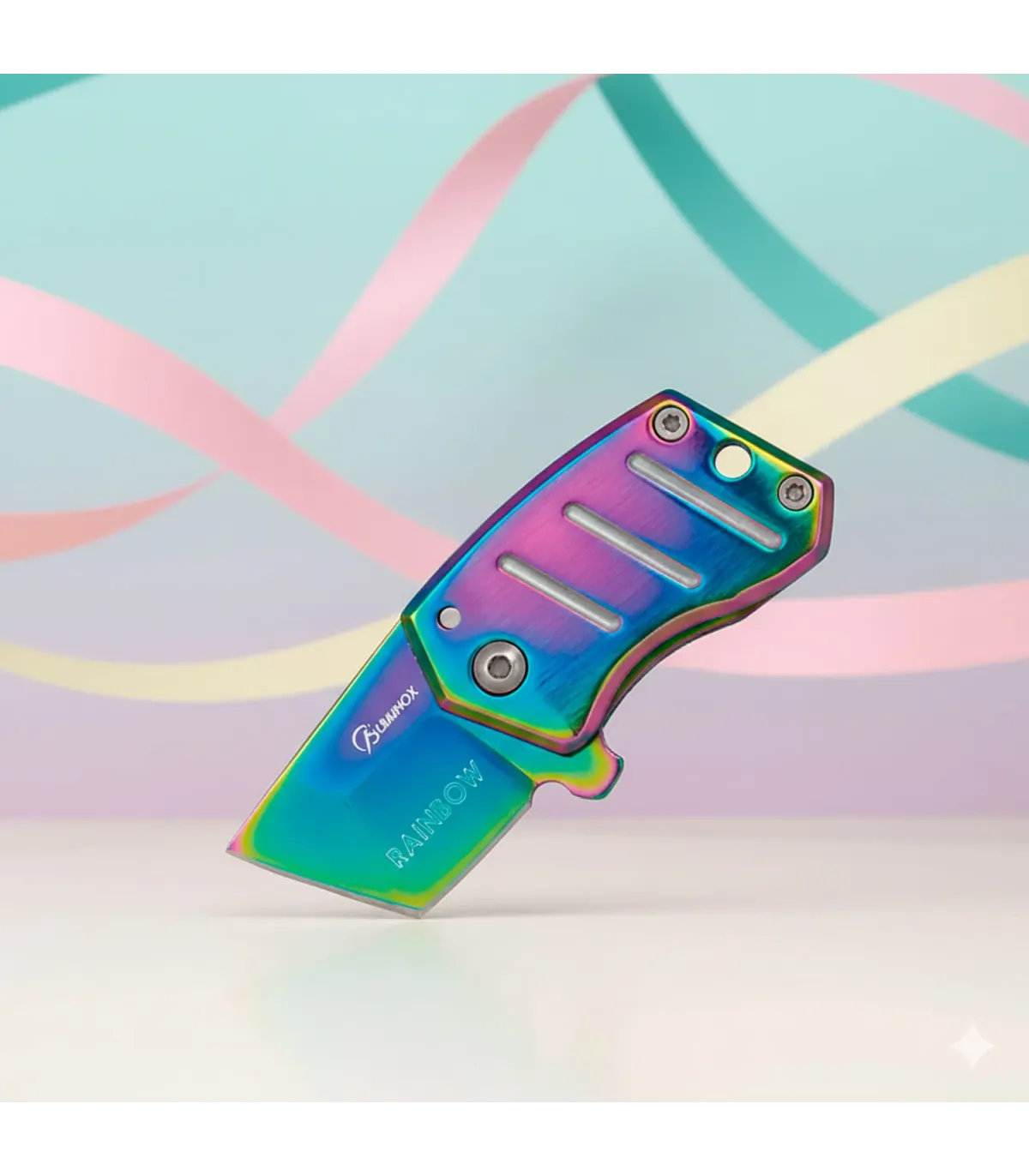 Procurando uma navalha pequena, mas com um estilo que não passe despercebido? Este modelo Rainbow oferece um design vibrante e sofisticado, perfeito para quem deseja combinar utilidade com um toque de cor único. Seu acabamento em rainbow proporciona um efeito arco-íris metálico que captura a luz e confere um aspecto chamativo e moderno.