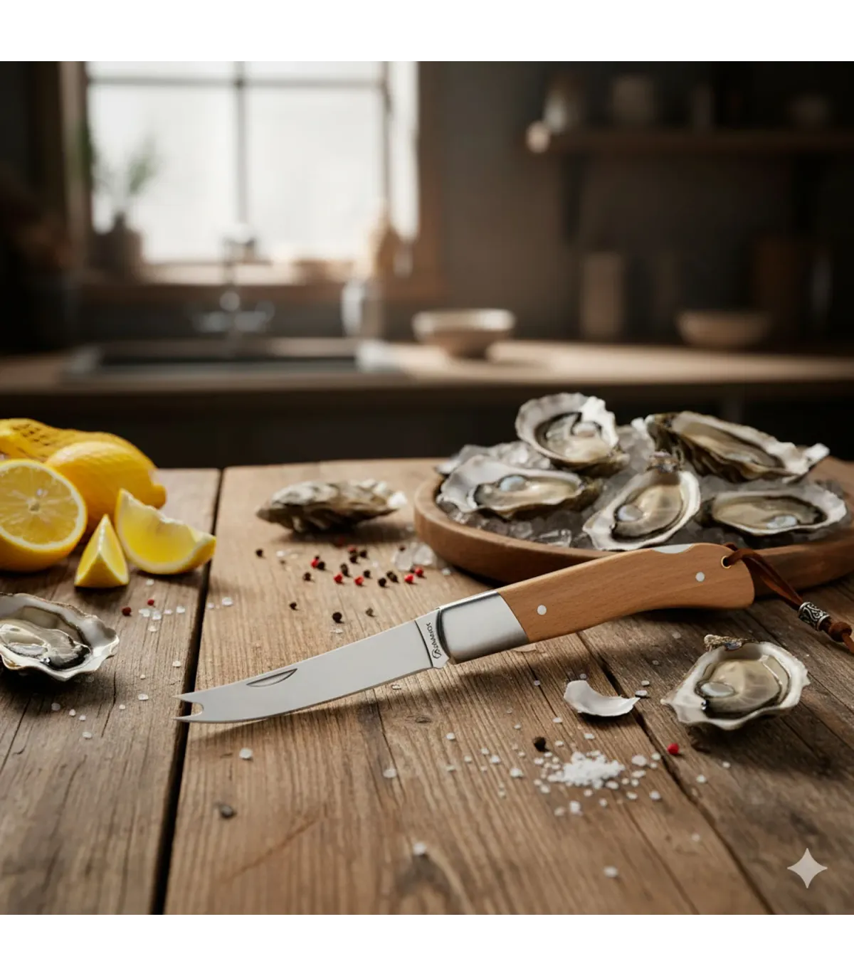 Além disso, conta com um acessório original tipo garfo integrado, que amplia sua utilidade em acampamentos ou piqueniques. A imagem de referência mostra um design cuidado, com acabamento acetinado e um laço decorativo na extremidade da empunhadura para uso funcional ou decorativo. A combinação entre aço e madeira realça seu caráter autêntico e resistente.