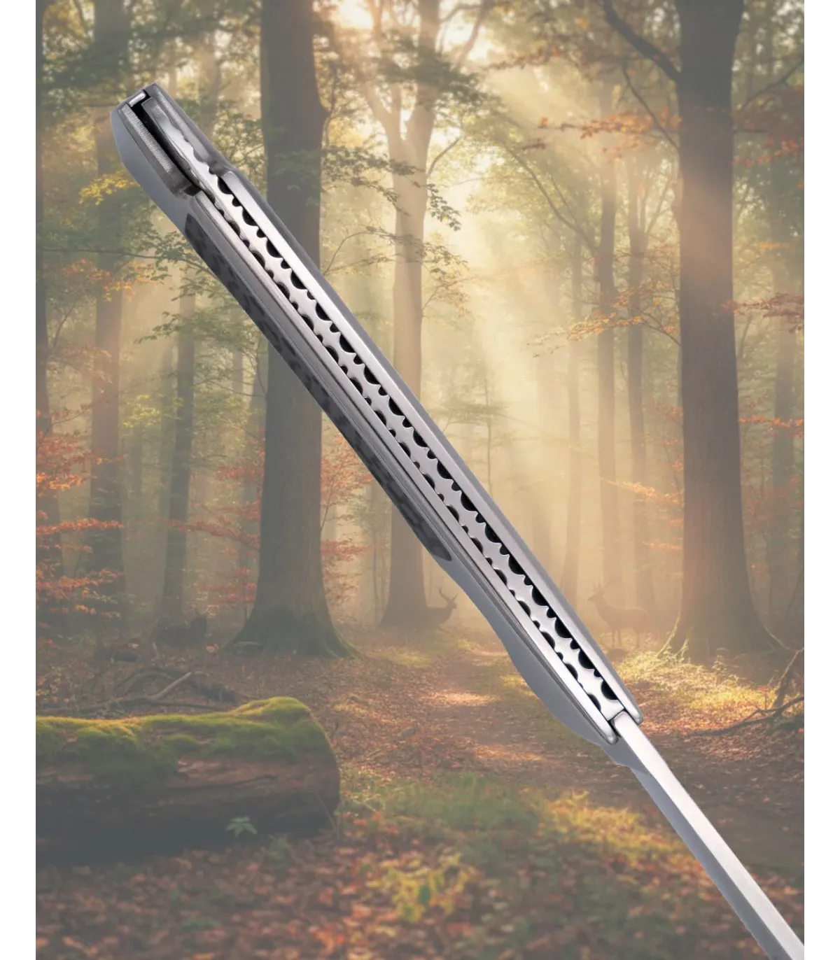 A empunhadura, com inserção de fibra de carbono e zonas texturizadas, proporciona uma pegada confortável e antideslizante, perfeita para manusear o canivete com controle mesmo em tarefas exigentes. Seu design ergonômico se ajusta à mão, reduzindo a fadiga e melhorando a experiência de uso.
