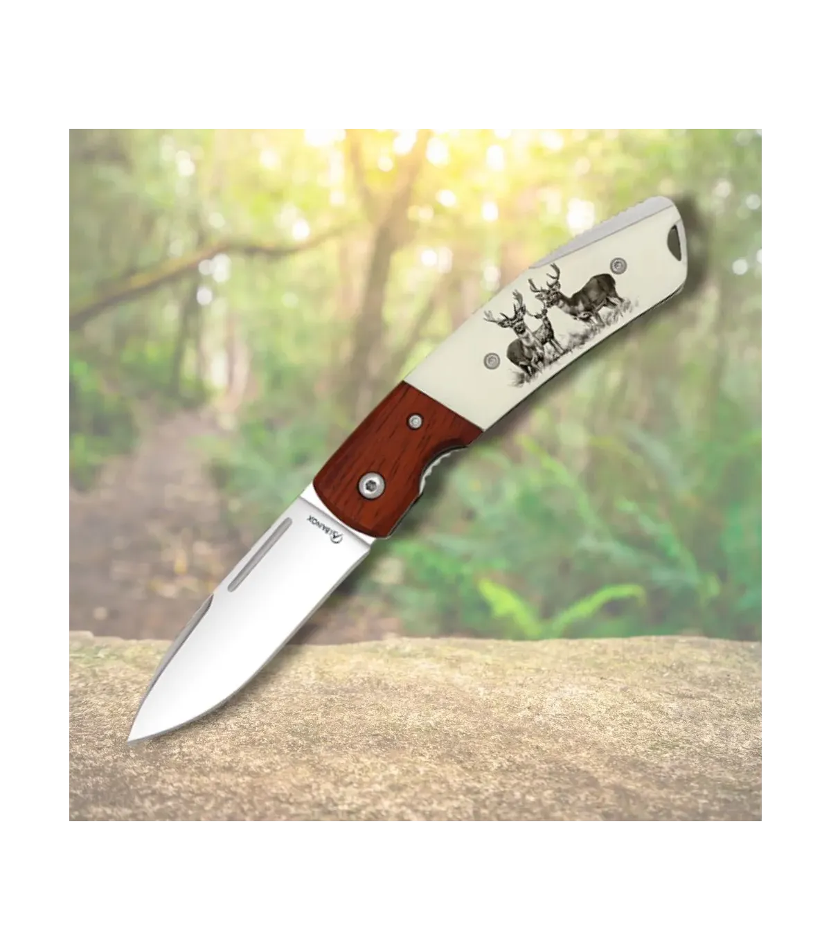 O cabo é uma obra de arte em si mesmo, fundindo tonalidades quentes e naturais com um toque de sofisticação graças à gravação de dois majestosos veados. Essa decoração não só traz beleza, mas também reflete o vínculo com o ambiente selvagem, evocando o espírito do caçador e amante da natureza.