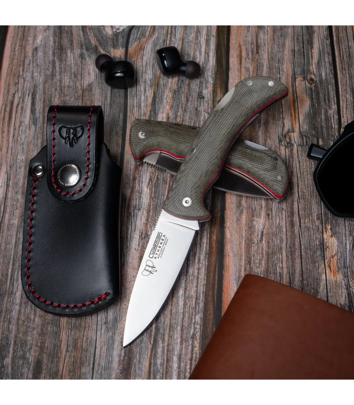 Com uma dureza de aço de 60/61 HRc, o canivete Athenea é incrivelmente resistente e durável, garantindo um desempenho ótimo mesmo nas condições mais exigentes. O sistema de fechamento traseiro oferece segurança adicional, mantendo a lâmina firmemente no lugar. O encaixe do cabo com fio de aço garante uma pegada sólida e confortável, proporcionando controle absoluto em cada movimento. O cabo de lona verde com separador vermelho não é apenas visualmente atraente, mas também oferece uma pegada antiderrapante e uma aparência distintiva. Além disso, o canivete Athenea vem acompanhado de uma bainha de couro preto, que não só oferece proteção adicional, mas também acrescenta um toque de elegância e sofisticação ao seu equipamento de caça.