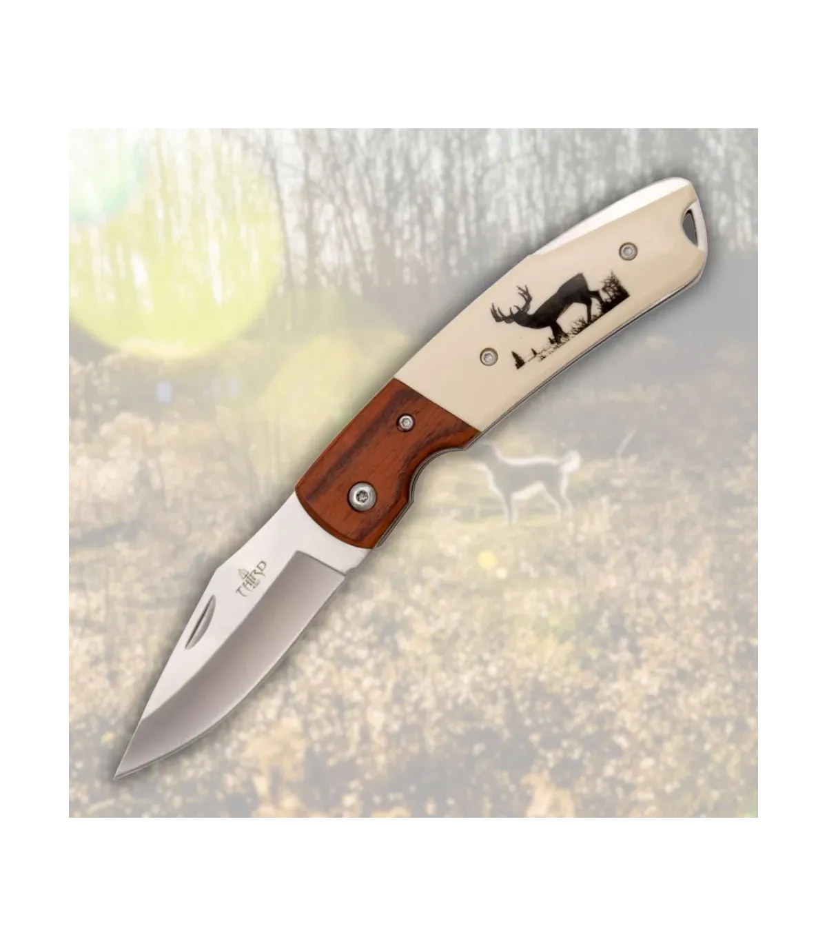A empunhadura, que combina madeira e ABS, apresenta uma gravação decorativa de um veado, adicionando um toque rústico e distintivo. Este design não só proporciona uma estética única, mas também oferece uma pegada confortável e segura graças ao seu comprimento de 11,5 cm. A virola de madeira reforça a empunhadura, aumentando a durabilidade do canivete e mantendo um equilíbrio ideal.