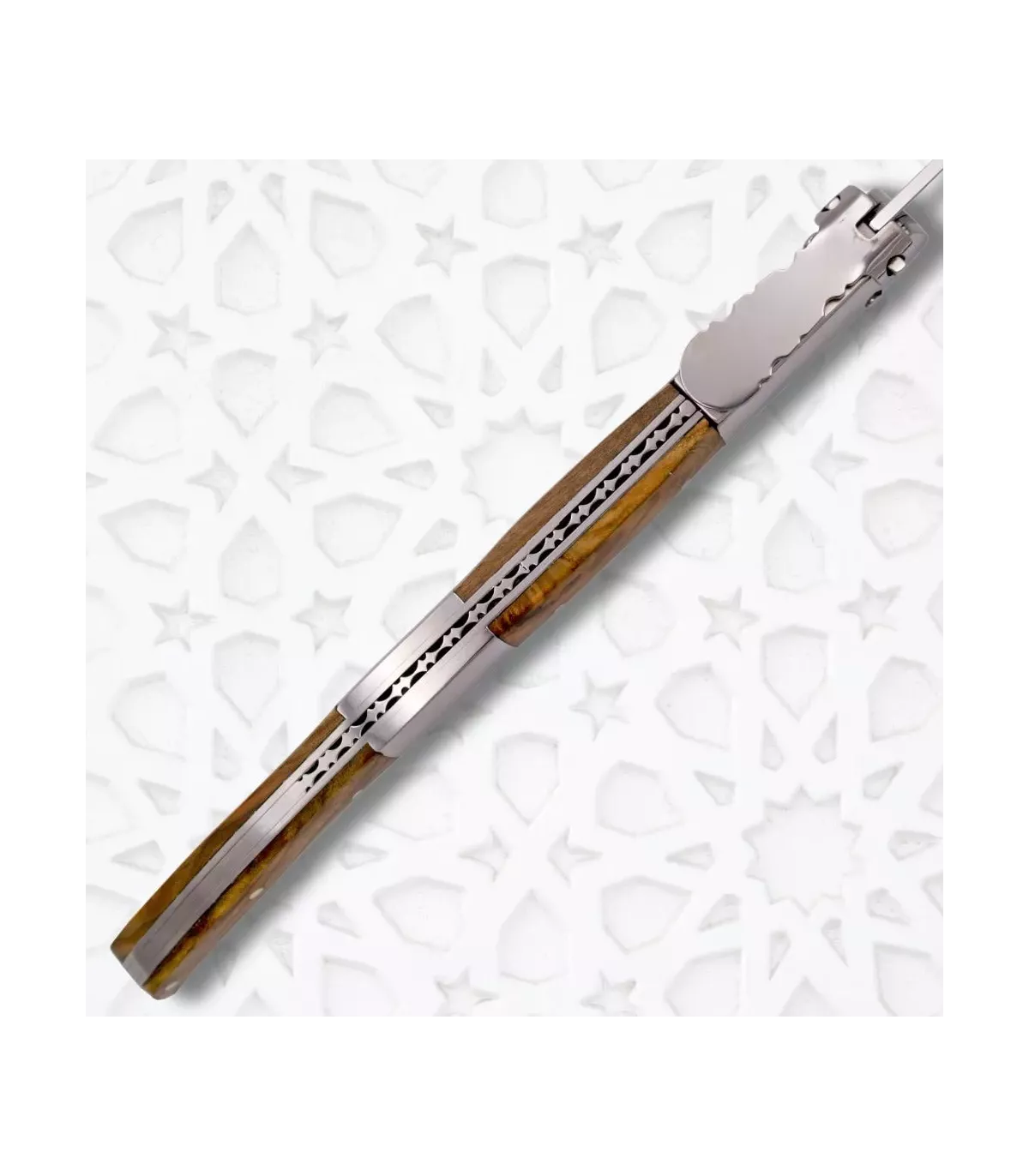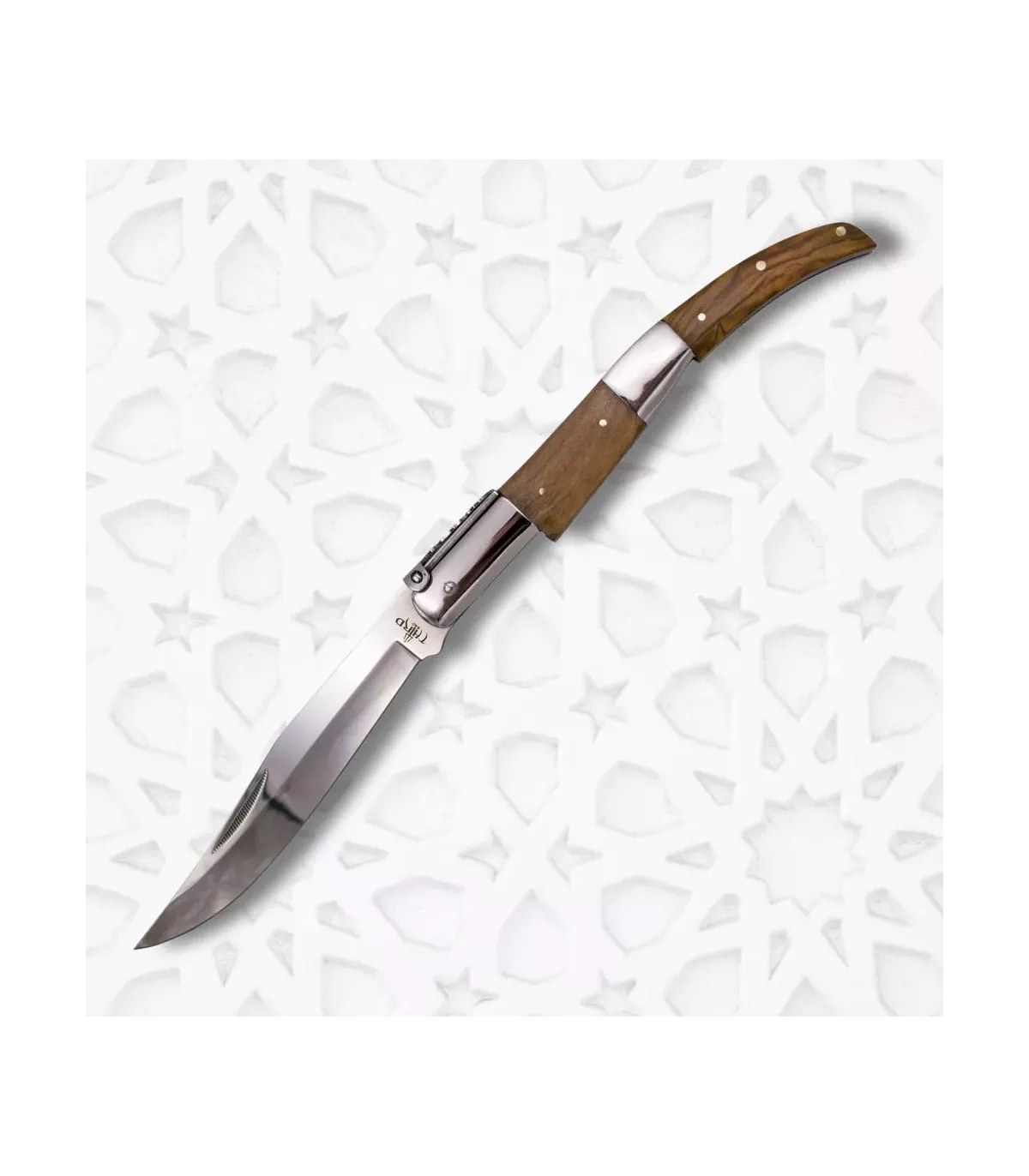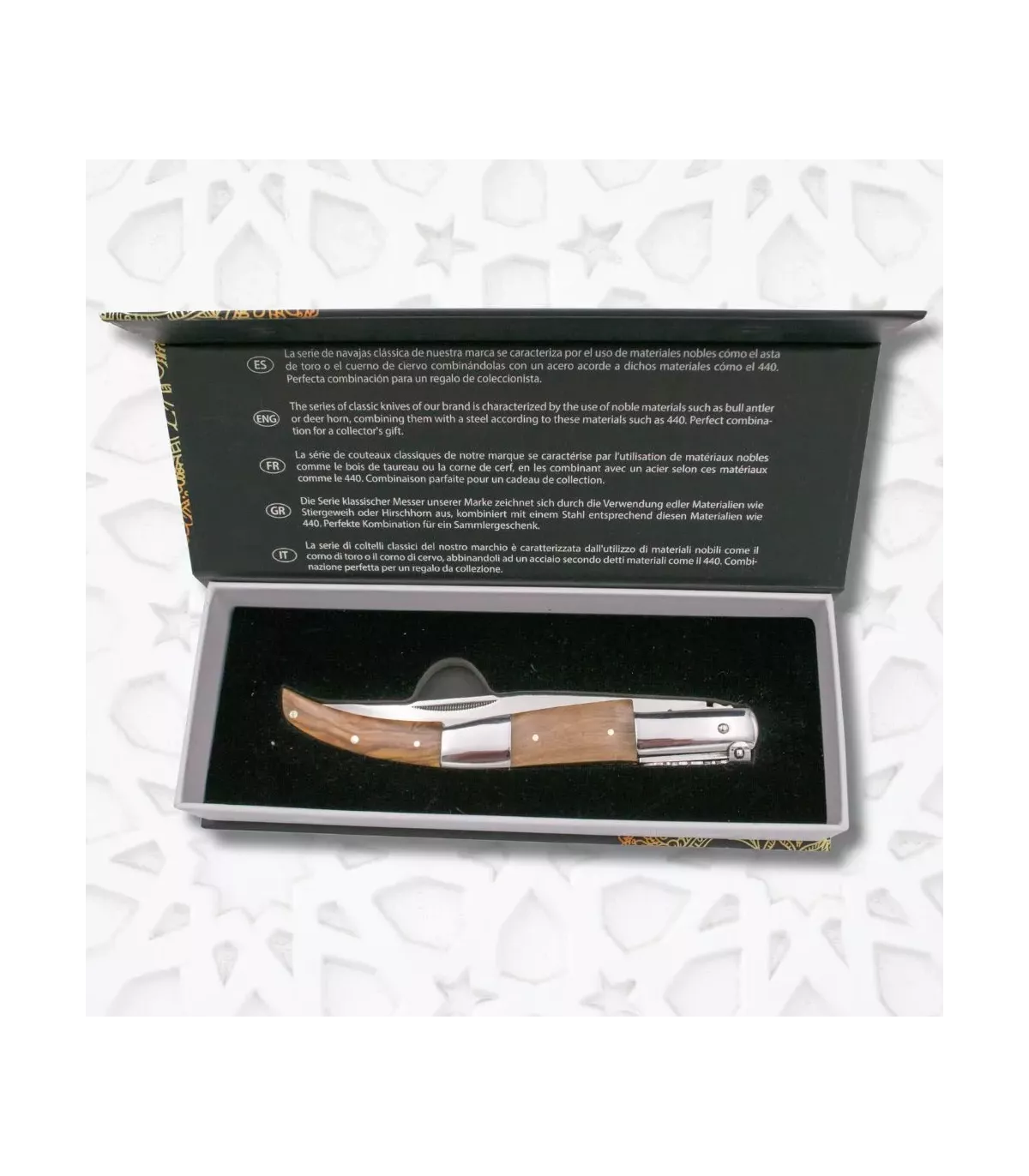 A empunhadura, feita de aço inoxidável e com inserções requintadas de madeira de oliveira, não só proporciona uma pegada confortável, mas também acrescenta um toque de distinção. Cada canivete é único, graças às variações naturais da madeira, tornando-se um presente perfeito para os amantes de artesanato e natureza.