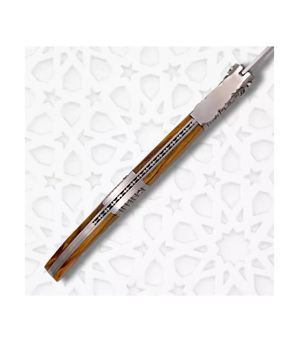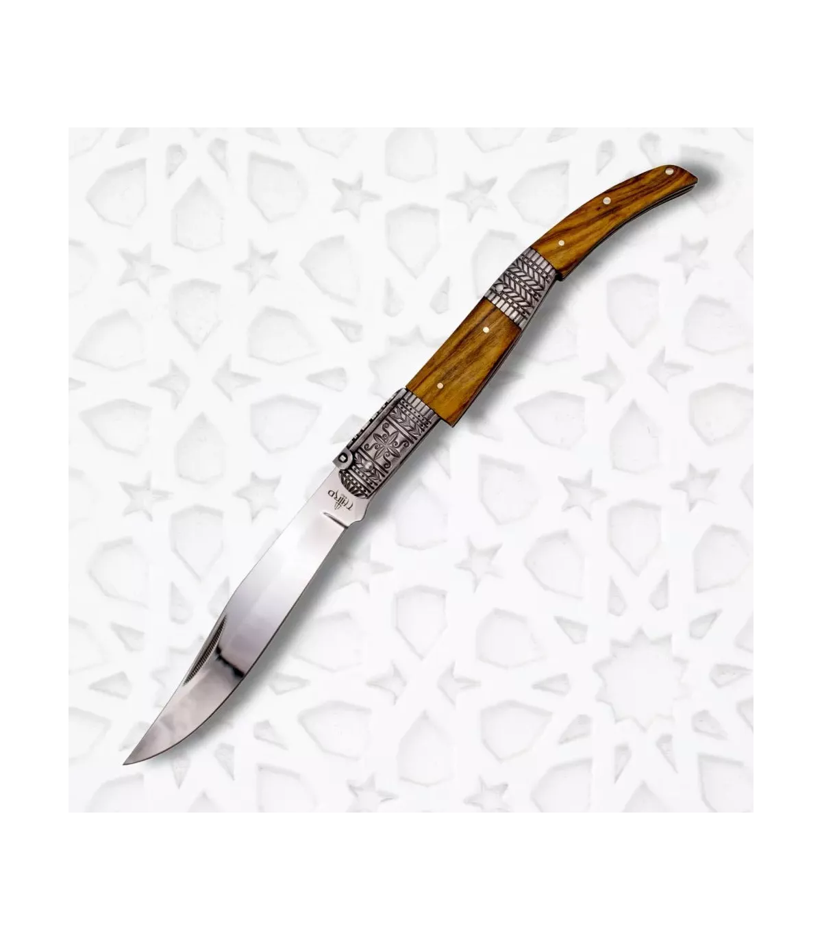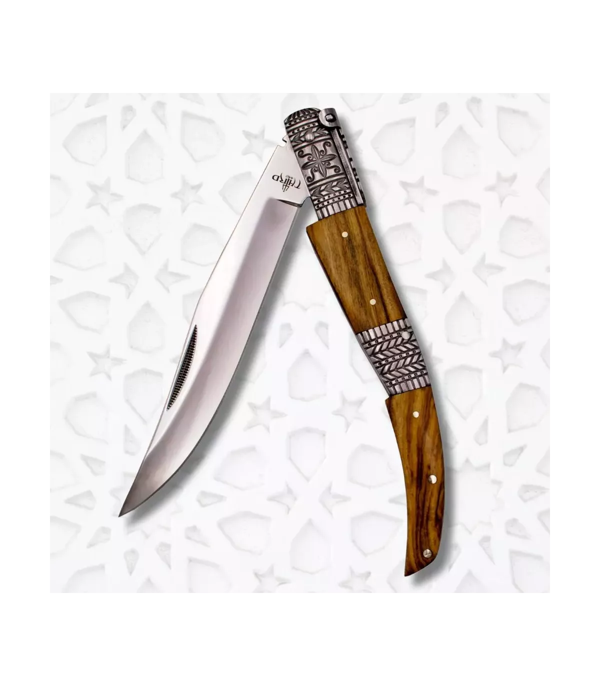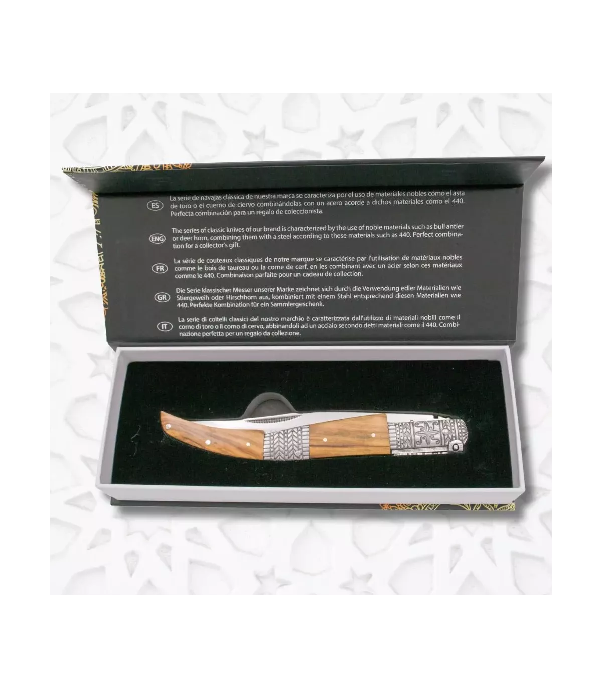 A empunhadura, feita de aço inoxidável e madeira de oliveira, não é apenas visualmente atraente, mas também proporciona uma pegada confortável e segura. Os detalhes decorativos em relevo, inspirados nas facas clássicas espanholas do século XIX, evocam uma rica herança cultural, tornando cada uso uma experiência única.