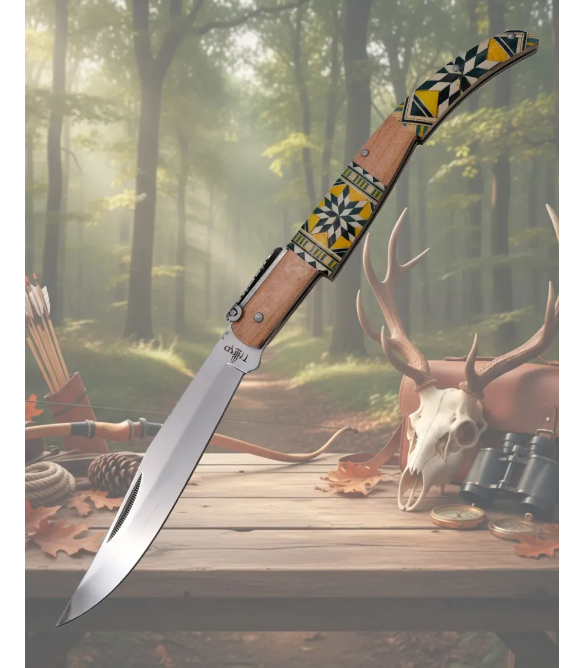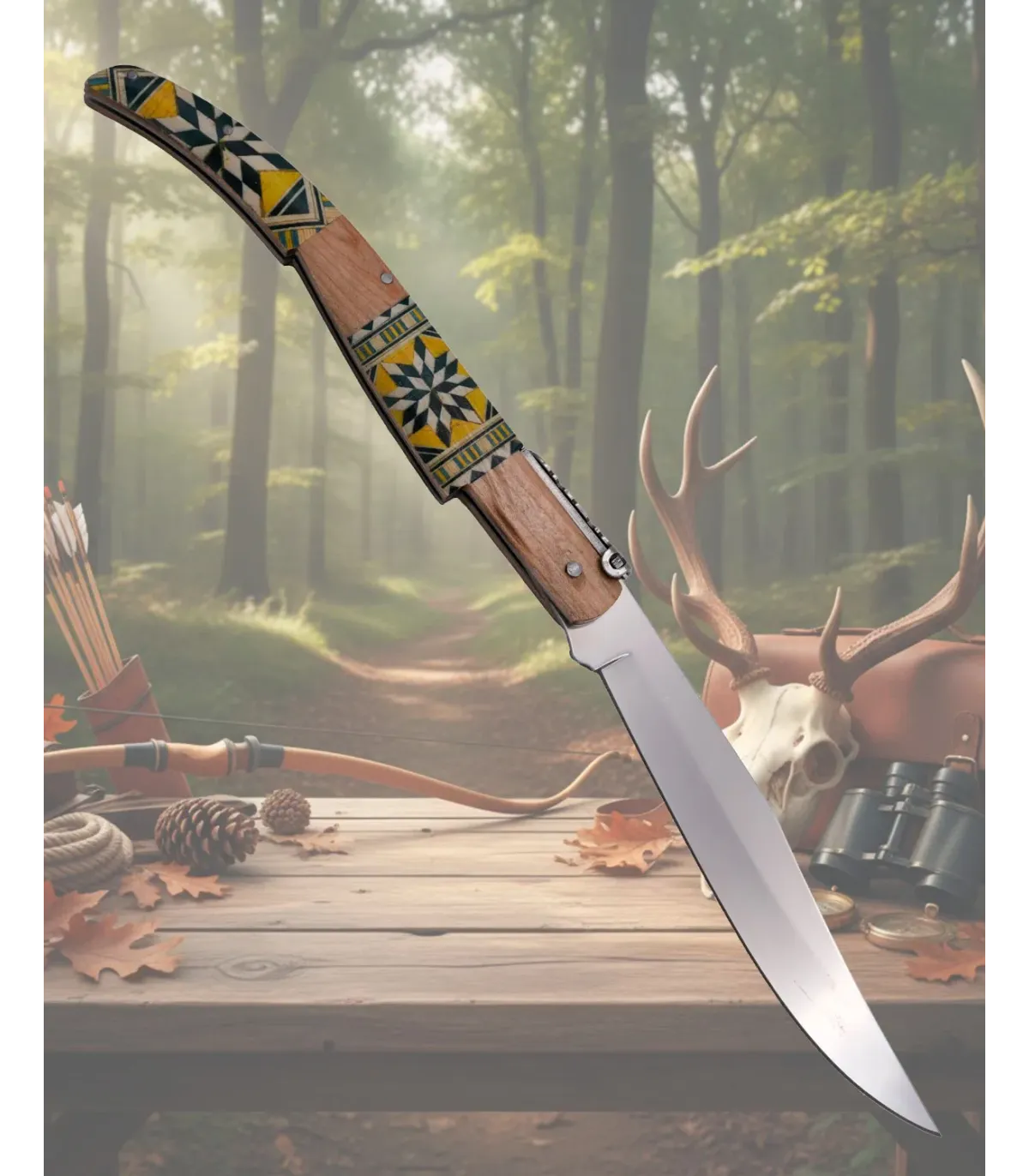 Este modelo apresenta um trabalho realizado com precisão CNC e um acabamento que imita a marchetaria, pensado para quem valoriza a união entre estética e funcionalidade. A empunhadura em madeira Maple combina áreas de tonalidade clara com painéis decorativos em amarelo, preto e bege, criando um contraste atraente que chama a atenção sem perder discrição. A forma curva e ergonômica do cabo facilita uma pegada natural, reduzindo a fadiga e oferecendo controle em cada movimento.