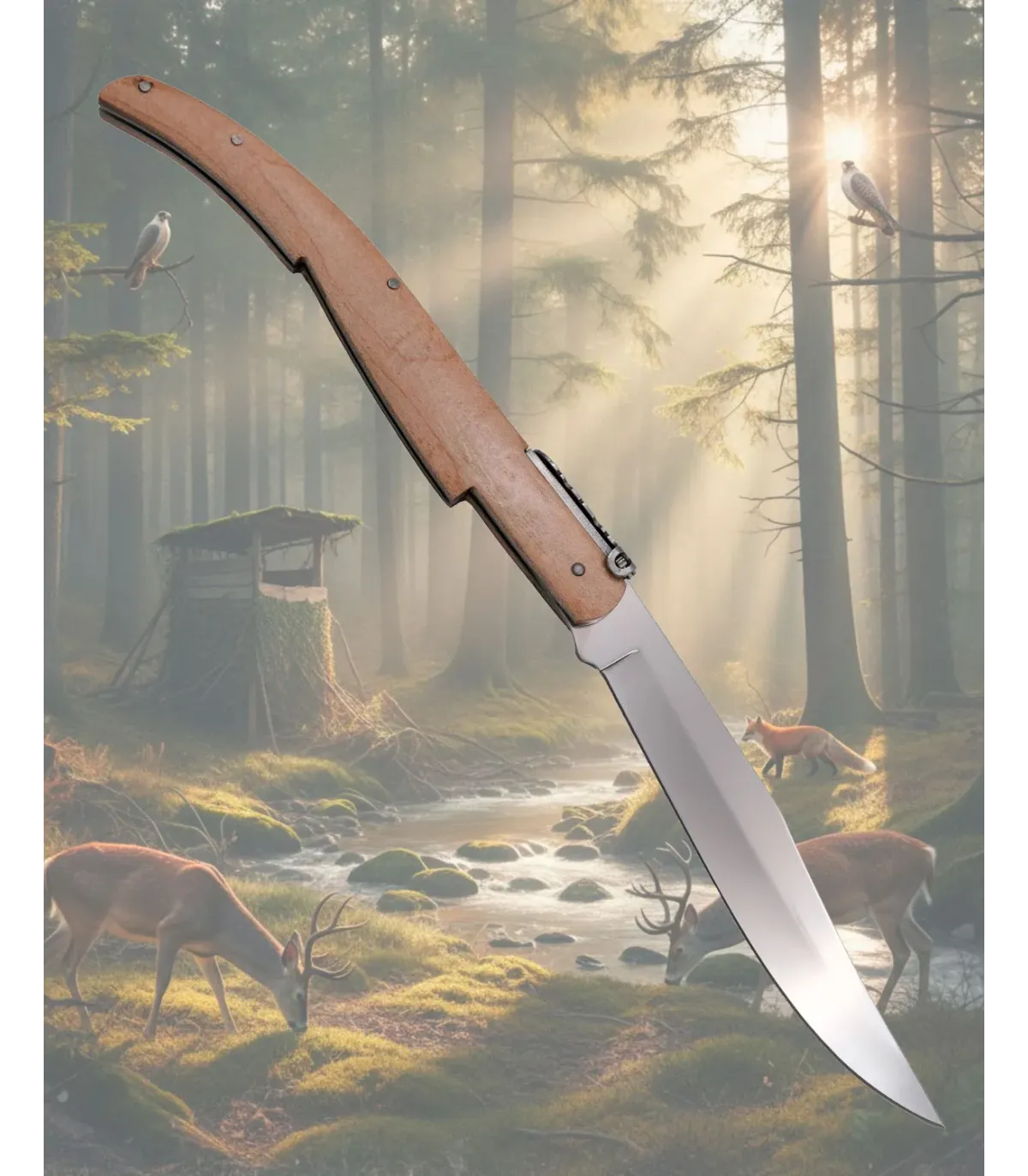 A empunhadura em madeira de bordo traz calor visual e uma sensação ergonômica, curva sutilmente para se adaptar à mão e permitir uma pegada natural, segura e confortável em uso prolongado. Os três rebites visíveis e os detalhes metálicos não apenas reforçam a estrutura, mas também acrescentam caráter, transformando a peça em um objeto que se destaca tanto no uso cotidiano quanto na coleção.