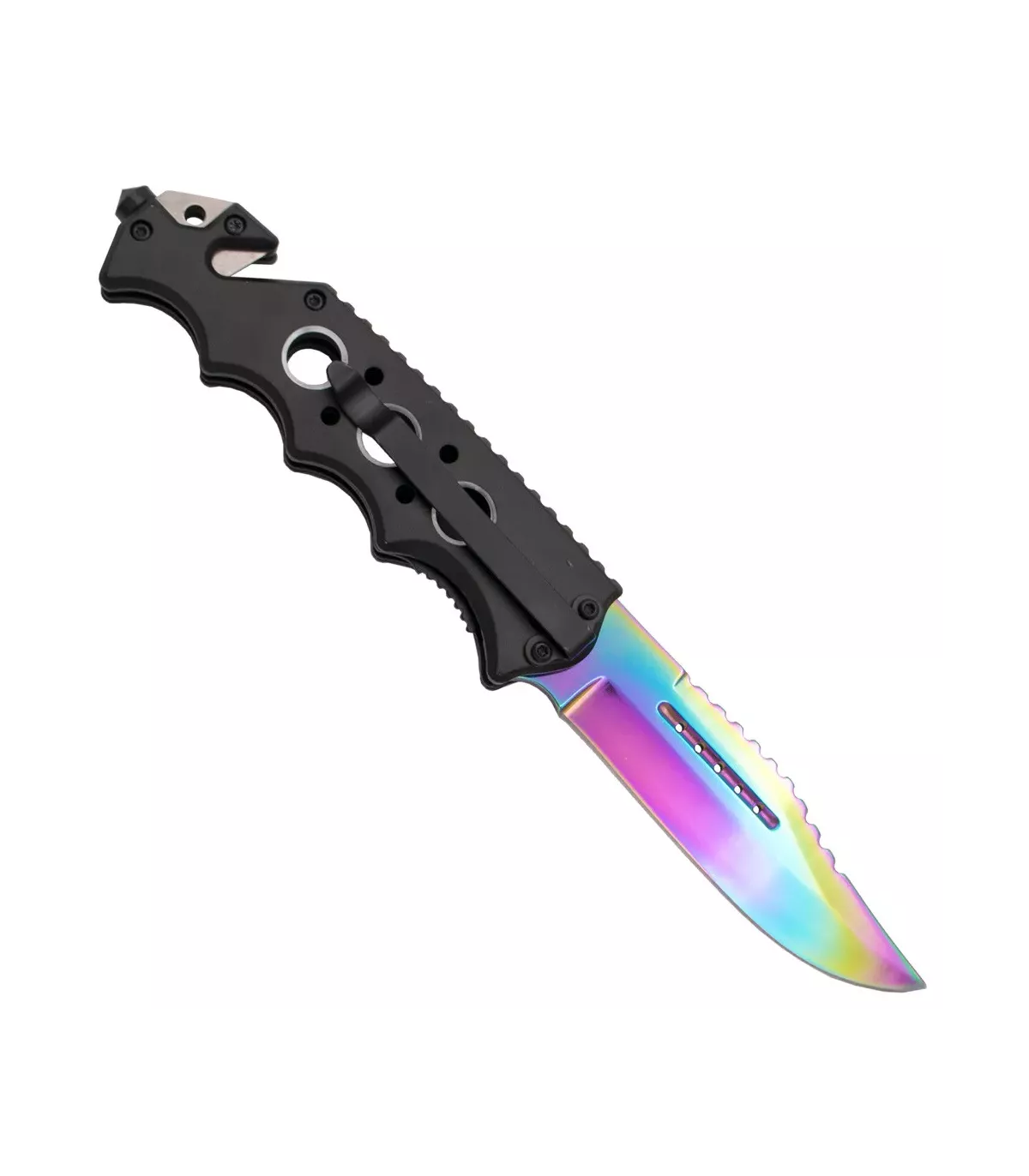 O Canivete Tático Third Design Caveira Arco-íris é uma peça que combina um design audacioso com uma funcionalidade excepcional. Com um comprimento total de 21,2 cm, este canivete apresenta-se como uma opção robusta e estilizada para quem busca um acessório que se destaque tanto pela aparência quanto pelo desempenho.