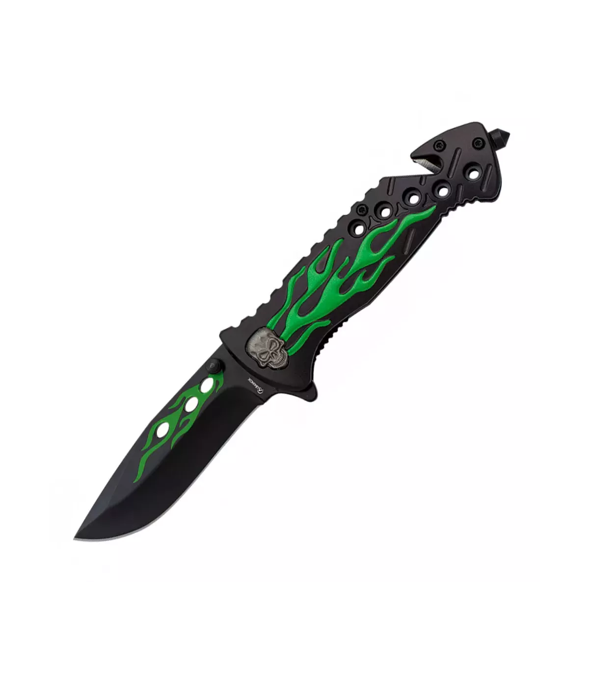 Prepare-se para se destacar com estilo e preparação para qualquer eventualidade com o Canivete Resgate Caveira em Chamas Verde da Albainox! A CALAVERA VERDE não é apenas uma ferramenta indispensável, mas também um símbolo do seu espírito aventureiro e determinado.