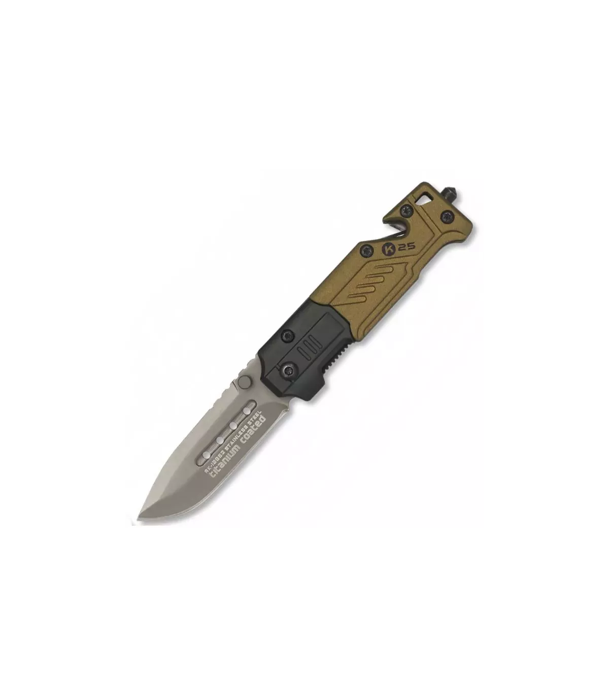 O Canivete de Resgate marca K25 é uma ferramenta de alta qualidade projetada na Espanha. Aqui está uma descrição detalhada de suas características: