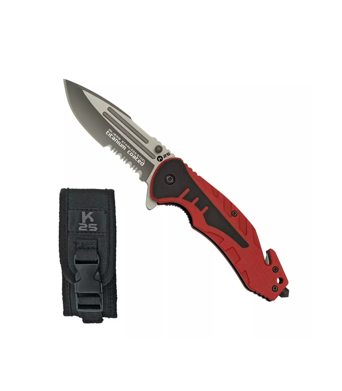 Descubra a potência e versatilidade do Canivete de resgate da marca K25 em seu chamativo design nas cores vermelho e preto. Equipado com um sistema de abertura rápida (FOS), este canivete oferece uma resposta instantânea em qualquer situação. Sua lâmina de aço inoxidável revestida em titânio, com comprimento de 8,7 cm e espessura de 3,3 mm, garante desempenho excepcional e durabilidade em cada uso.