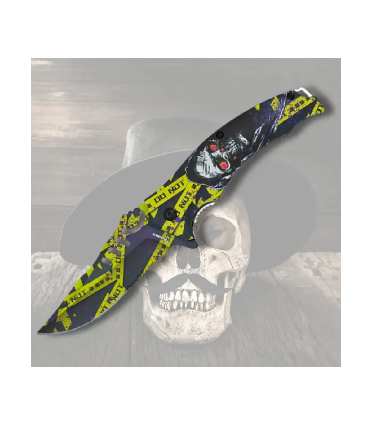 Sua lâmina curva, revestida em um preto intenso que destaca os detalhes vibrantes em amarelo e púrpura, não só atrai todos os olhares, mas oferece uma experiência de corte suave e precisa graças à qualidade do aço 3Cr13Mov. A ilustração da caveira com olhos vermelhos e a fita 'DO NOT' imprime-lhe um caráter inconfundível, ideal para quem valoriza personalidade em suas ferramentas.