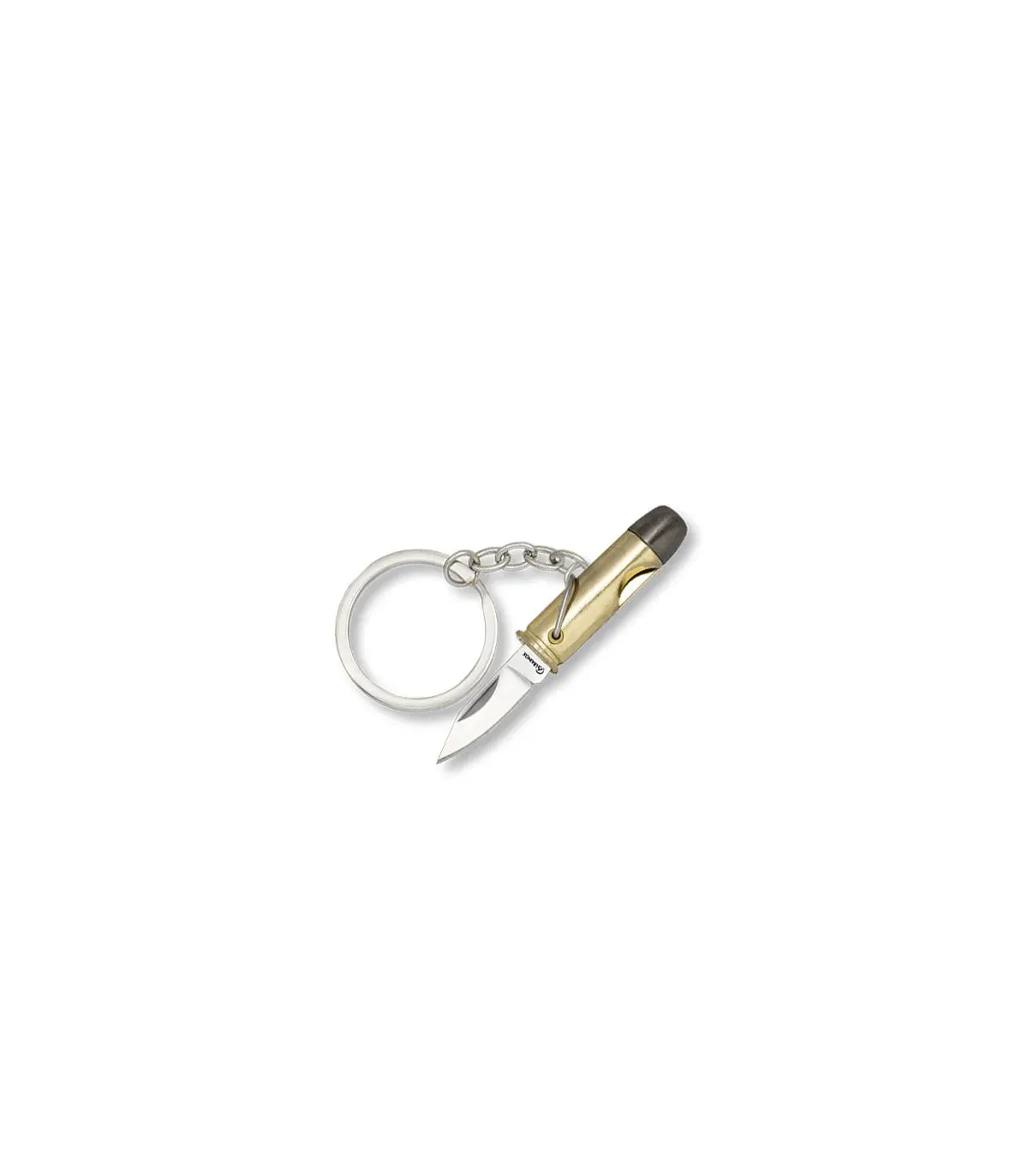Canivete chaveiro bala pendurado, lâmina de 3 cm. A lâmina é forjada em aço 3Cr13MOV. O tamanho total do canivete aberto é de 7,20 cm. O tipo de trava é de pistão.