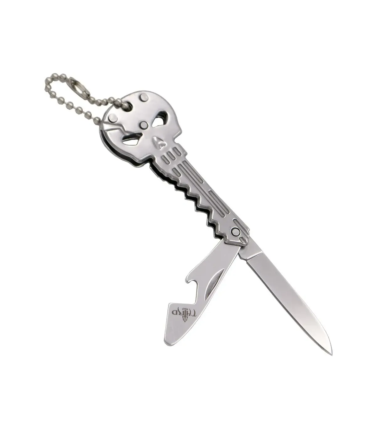 O Canivete Chaveiro da prestigiada marca espanhola Third é o companheiro perfeito para ter sempre à mão. Com uma lâmina fabricada em aço inoxidável e acabamento polido, este canivete chaveiro combina funcionalidade e estilo em um único produto. Além disso, possui um prático abridor de garrafas integrado ao chaveiro, oferecendo ainda mais utilidade.