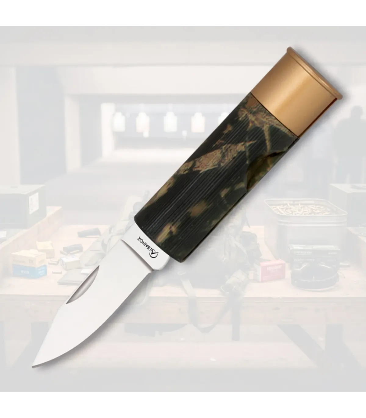 O cabo em ABS com padrão camuflado não só agrega caráter, mas também foi feito para um encaixe confortável e estável: suas estrias e forma cilíndrica favorecem o manuseio mesmo em situações de uso continuado, e o acabamento metálico em tom dourado adiciona um toque de distinção sem sacrificar a funcionalidade.