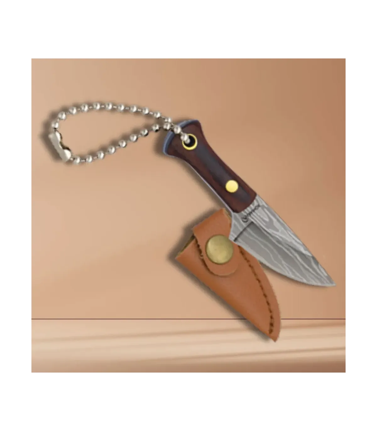 A empunhadura de madeira escura, com seu tom quente e um botão dourado que acrescenta um toque de distinção, adapta-se perfeitamente à mão, proporcionando uma pegada confortável e segura. Seja para atividades ao ar livre ou no seu dia a dia, esta faca torna-se uma extensão de você mesmo.