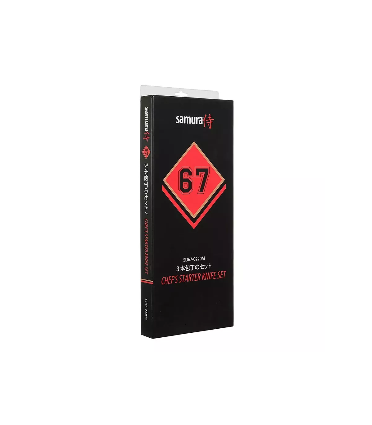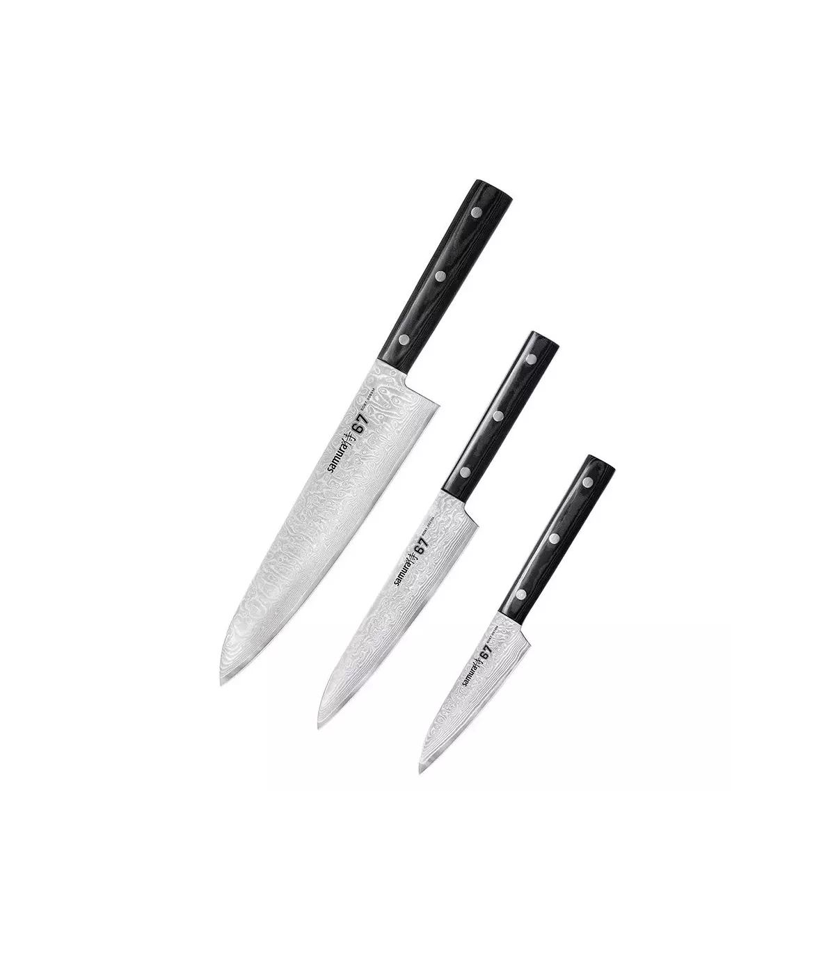 O conjunto de facas de cozinha Samura Damascus 67 é uma excelente opção tanto para iniciantes quanto para chefs experientes. Este conjunto inclui três tipos de facas essenciais: uma faca para descascar, uma faca de uso geral e uma faca de chef.