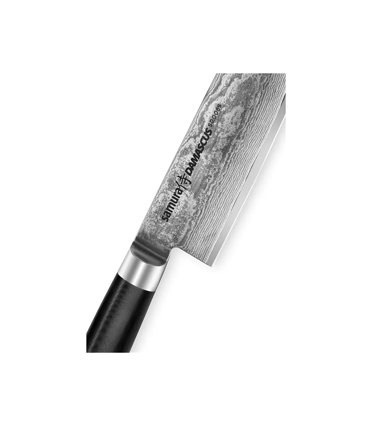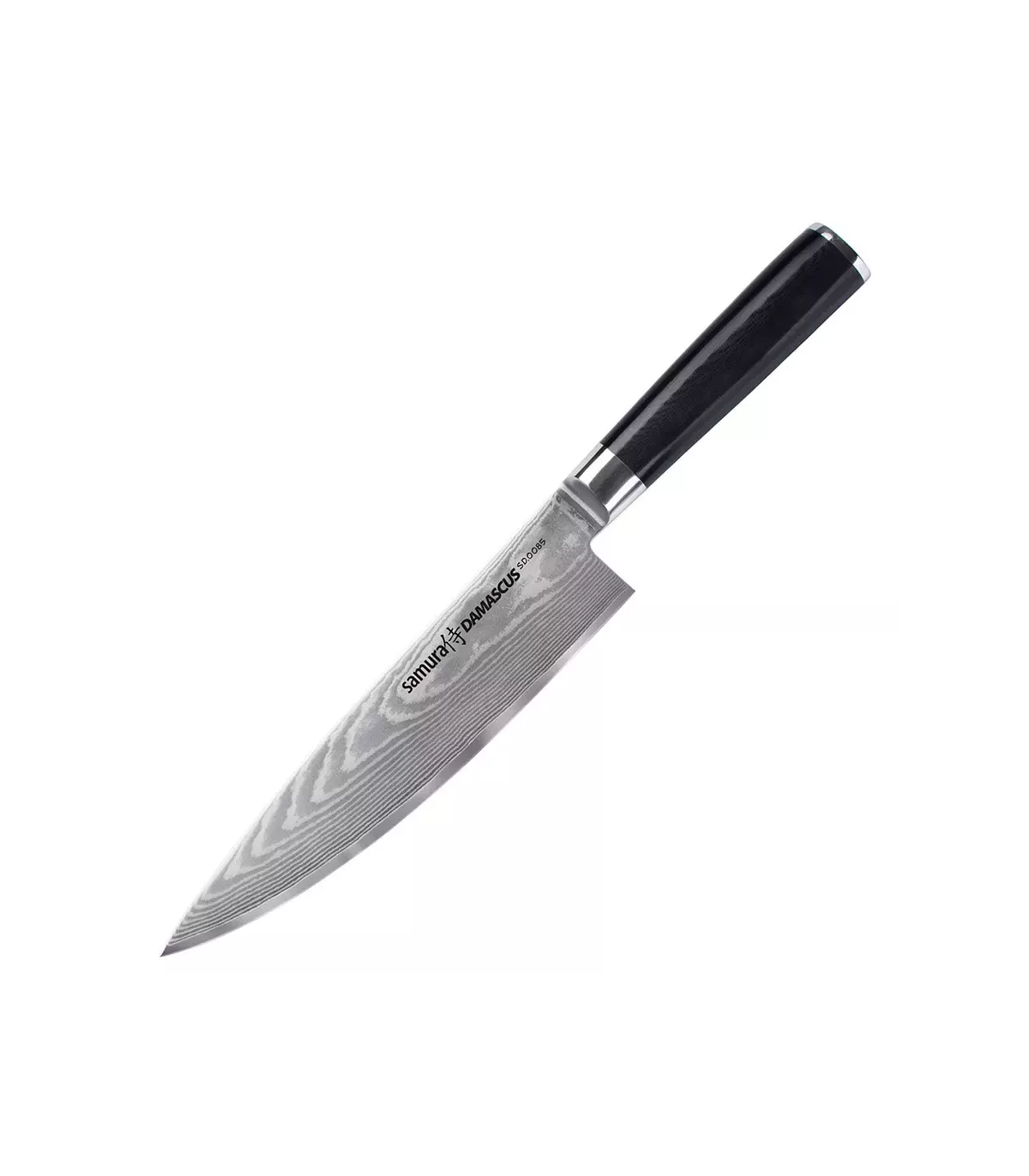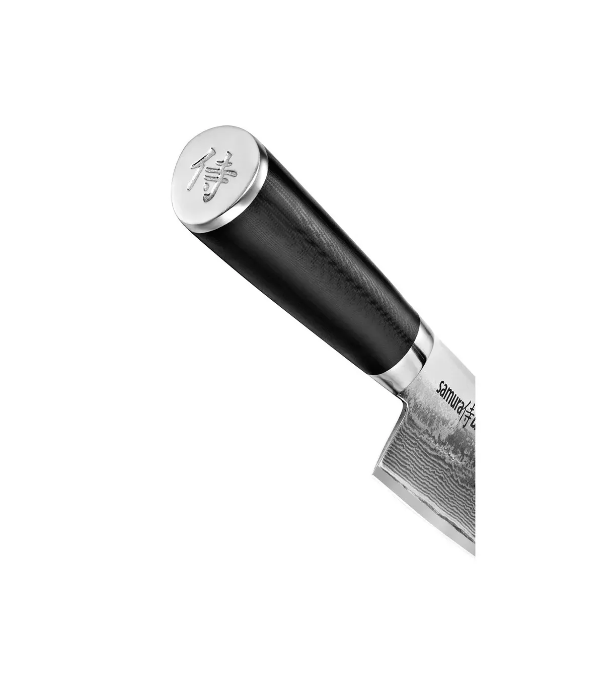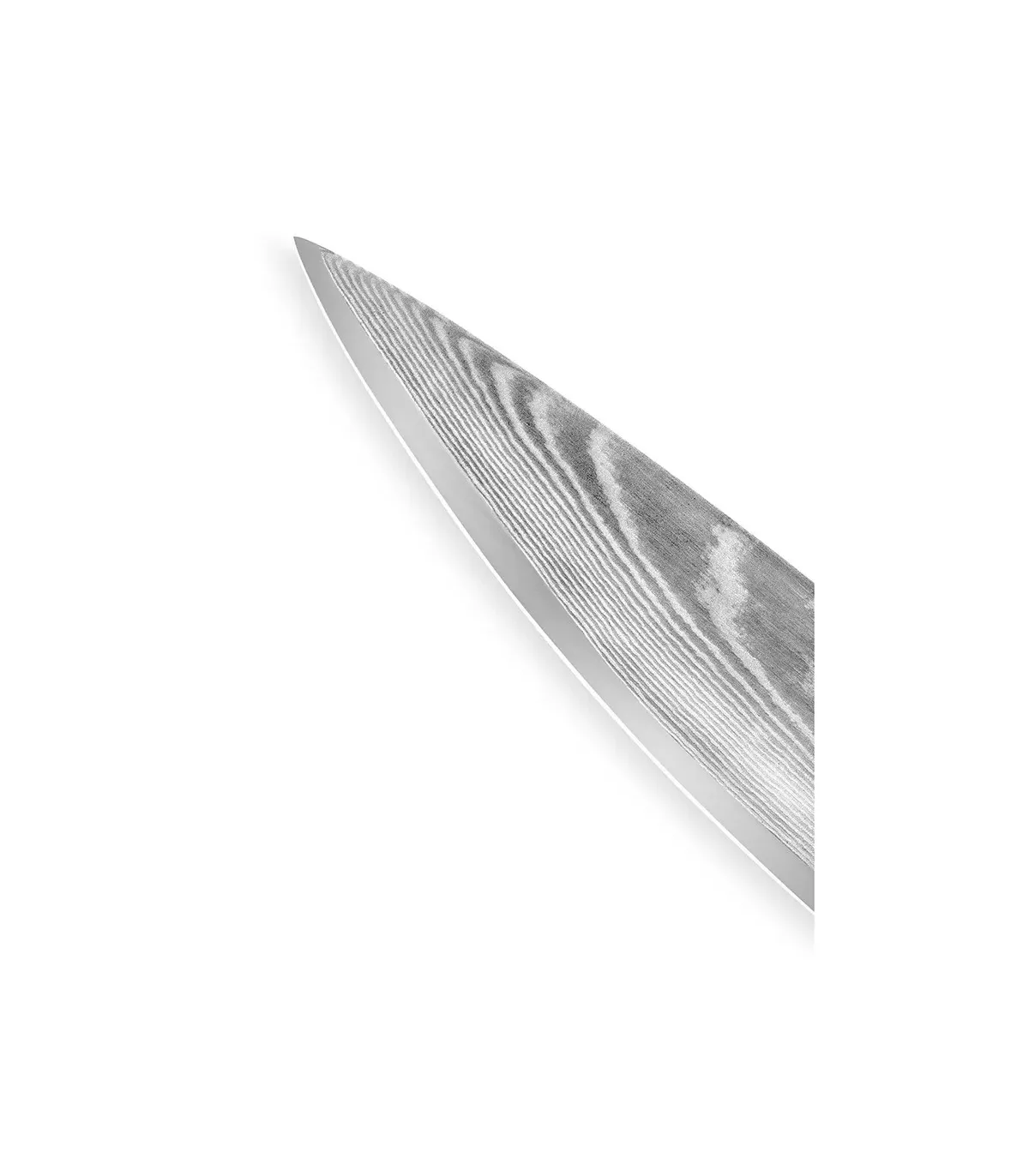 A faca de chef da série Damascus de Samura apresenta um design único e funcional. Com uma empunhadura pesada e uma lâmina grossa, larga e longa com uma ponta central, esta faca oferece o equilíbrio perfeito entre força e precisão. Seja picando repolho e legumes ou cortando carnes, peixes ou aves, esta faca de chef é indispensável na sua cozinha.