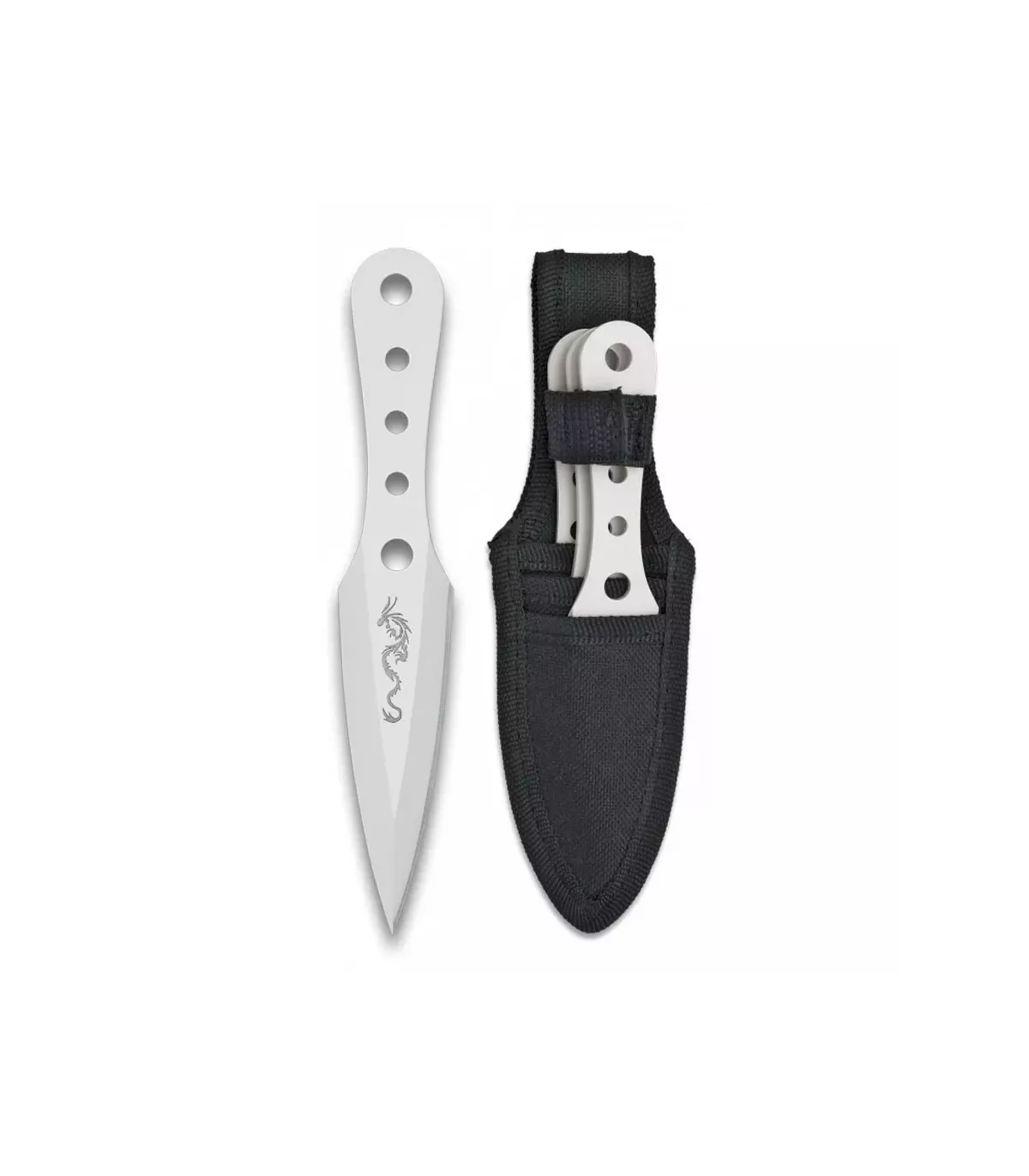 Está procurando um conjunto de facas lançadoras com um design único e marcante? Então, o conjunto de 3 lançadores de uma única lâmina, modelo White Dragon, é perfeito para você. Cada lançador mede 16,2 cm de comprimento e é fabricado em aço inoxidável.