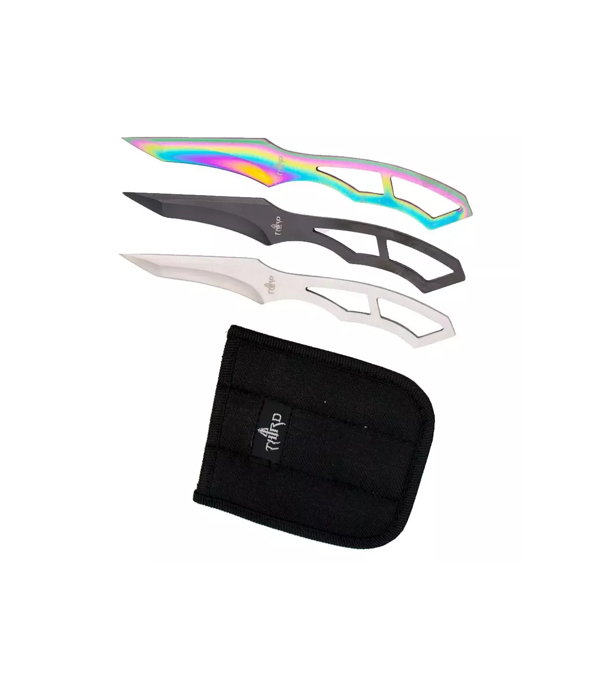 Gostaria de aprimorar suas habilidades de lançamento de facas? Então, o conjunto de 3 facas lançadoras Third H7121 com capa é perfeito para você! Com três peças de 18,5 cm cada, este conjunto é fabricado em aço 420 de alta qualidade e vem em três acabamentos diferentes: preto, fosco e rainbow, para que você possa escolher o que mais gostar.