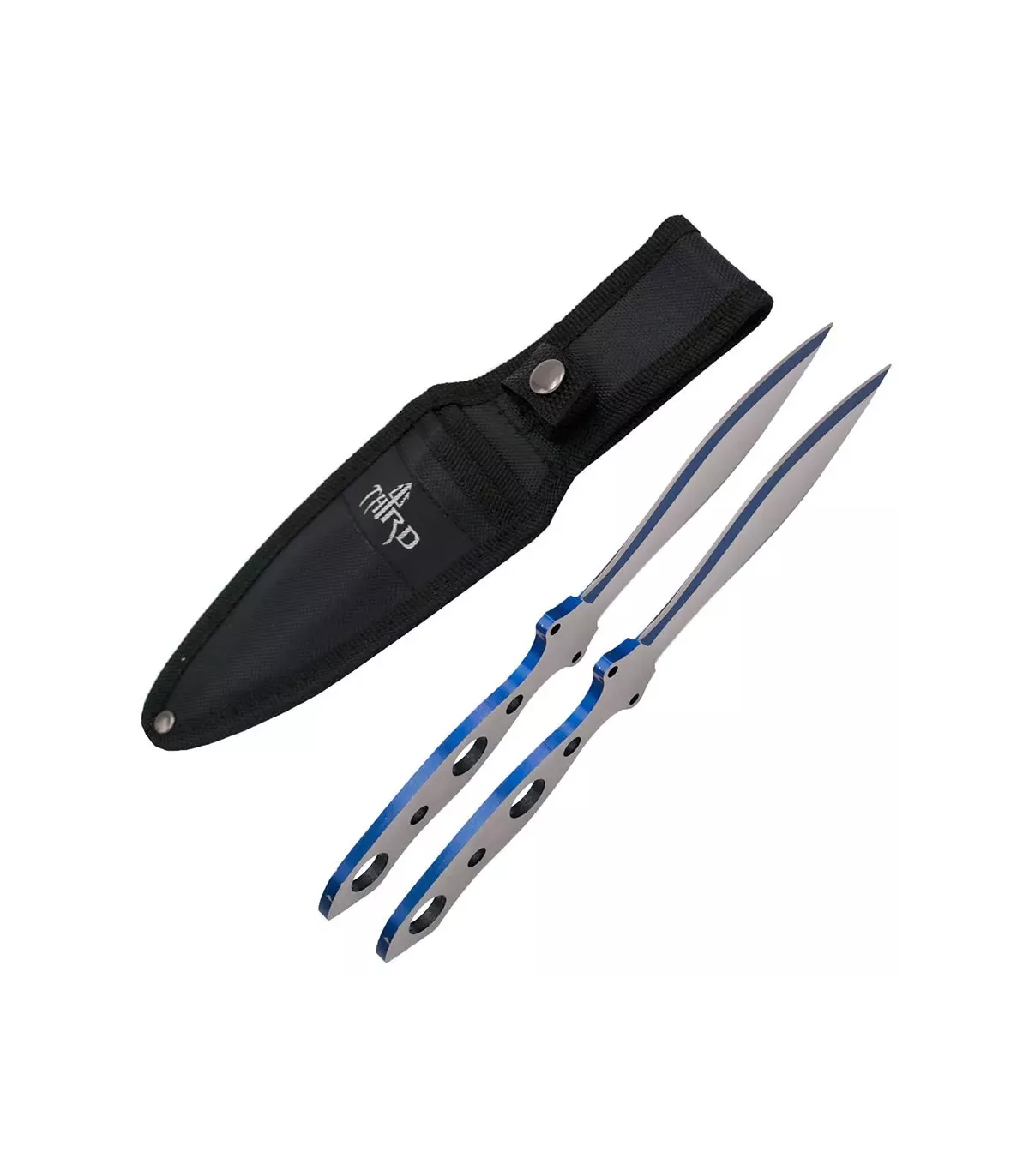 Cada faca lançadora possui uma lâmina de 10,7 cm de comprimento e uma espessura de lâmina de 4,15 mm, tornando-as perfeitas para um lançamento estável e preciso. Além disso, o conjunto de lançadoras de um só fio com acabamento prata-azul acompanha uma capa de nylon para mantê-las seguras e protegidas quando levadas consigo.