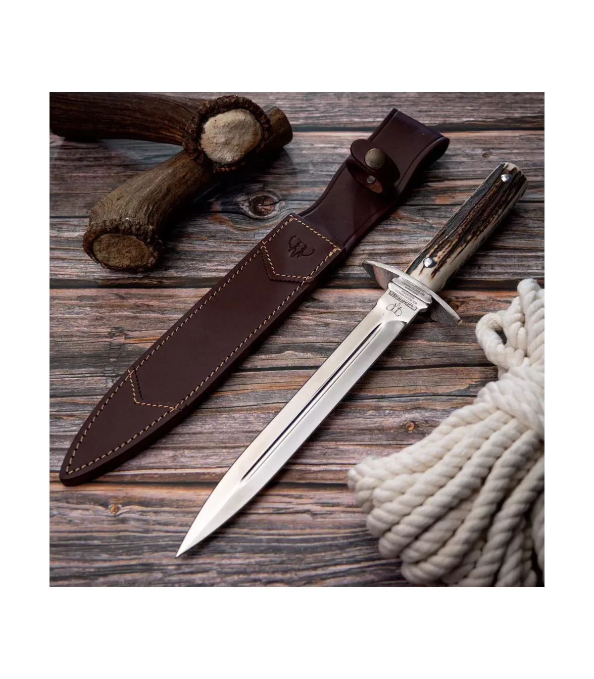 O cabo de chifre de cervo, cuidadosamente polido, proporciona um toque suave e uma estética impressionante. Cada detalhe desta adaga foi projetado para refletir a elegância e a paixão pela caça. Além disso, inclui uma bainha que garante a proteção e o transporte seguro da adaga.