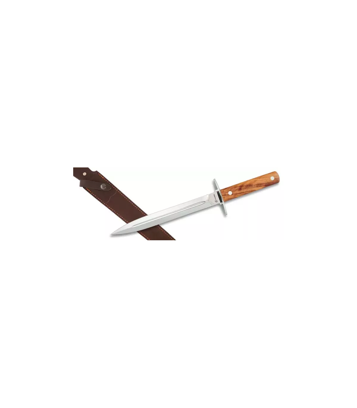 A empunhadura de madeira de olivo acrescenta um toque de elegância e autenticidade à faca. A madeira de olivo, conhecida por sua beleza natural e durabilidade, proporciona uma pega confortável e segura durante o uso.