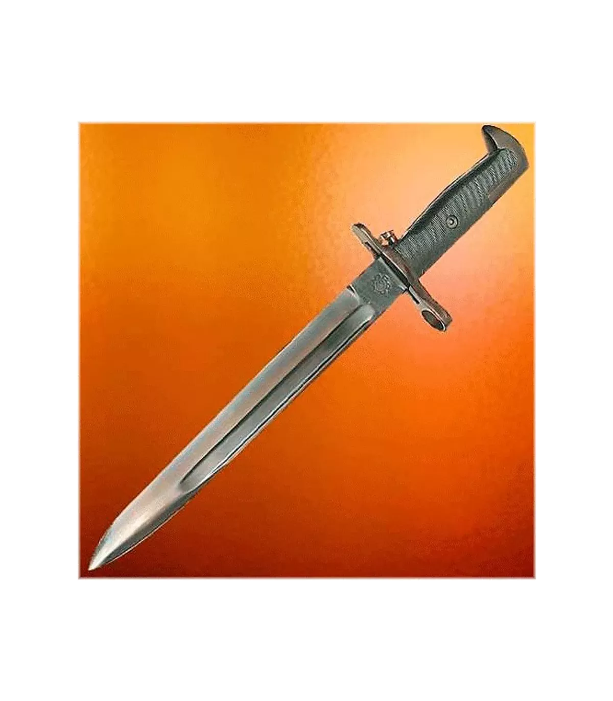 Faca Baioneta Rifle M1. O rifle M1 Garand foi utilizado pela primeira vez com a baioneta M1905 de 40 cm. Em 1942, o exército dos EUA determinou que uma baioneta mais curta era mais eficaz. As baionetas M1905 existentes foram reduzidas em 25 cm e novas baionetas de 25 cm foram fabricadas. As baionetas de corte geralmente possuem espiga completa que se estende até a ponta, mas este modelo, de fabricação nova, possui espiga completa até aproximadamente 7 cm acima da ponta. Esta baioneta é feita de acordo com especificações originais, em aço azulado de alto carbono, com empunhadura de plástico duro.