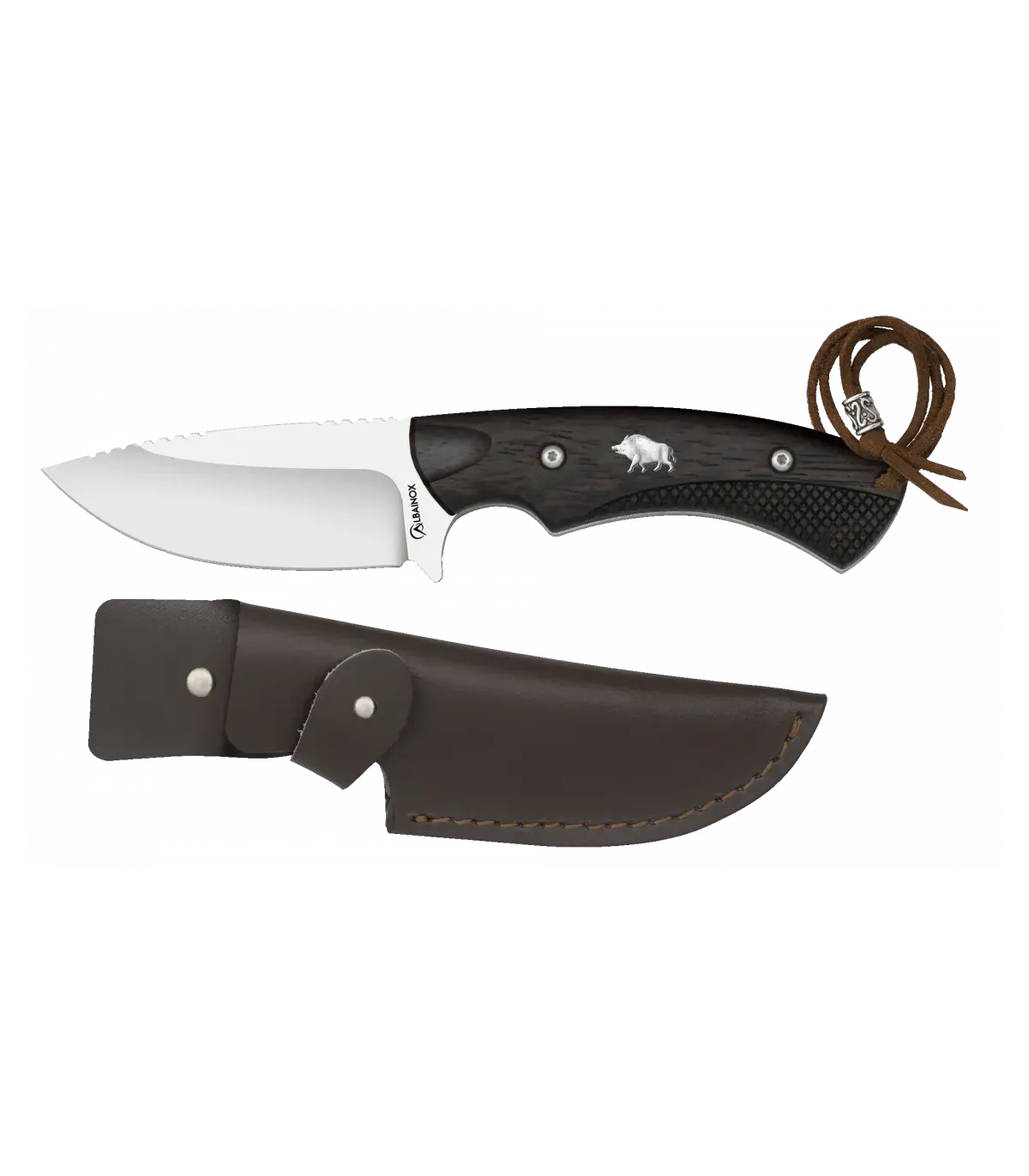 A faca vem com uma bainha de couro de alta qualidade que protege a lâmina quando não está em uso. Esta bainha, também com design CNC, ajusta-se perfeitamente à faca e garante uma proteção segura durante o transporte. Com peso de 191,00 g, esta faca é robusta e equilibrada, perfeita para enfrentar os desafios da caça ao javali ou outras presas de maior porte. A Faca de Caça Javali com Bainha de Couro apresenta-se numa elegante caixa Albainox, tornando-se uma excelente opção de presente.